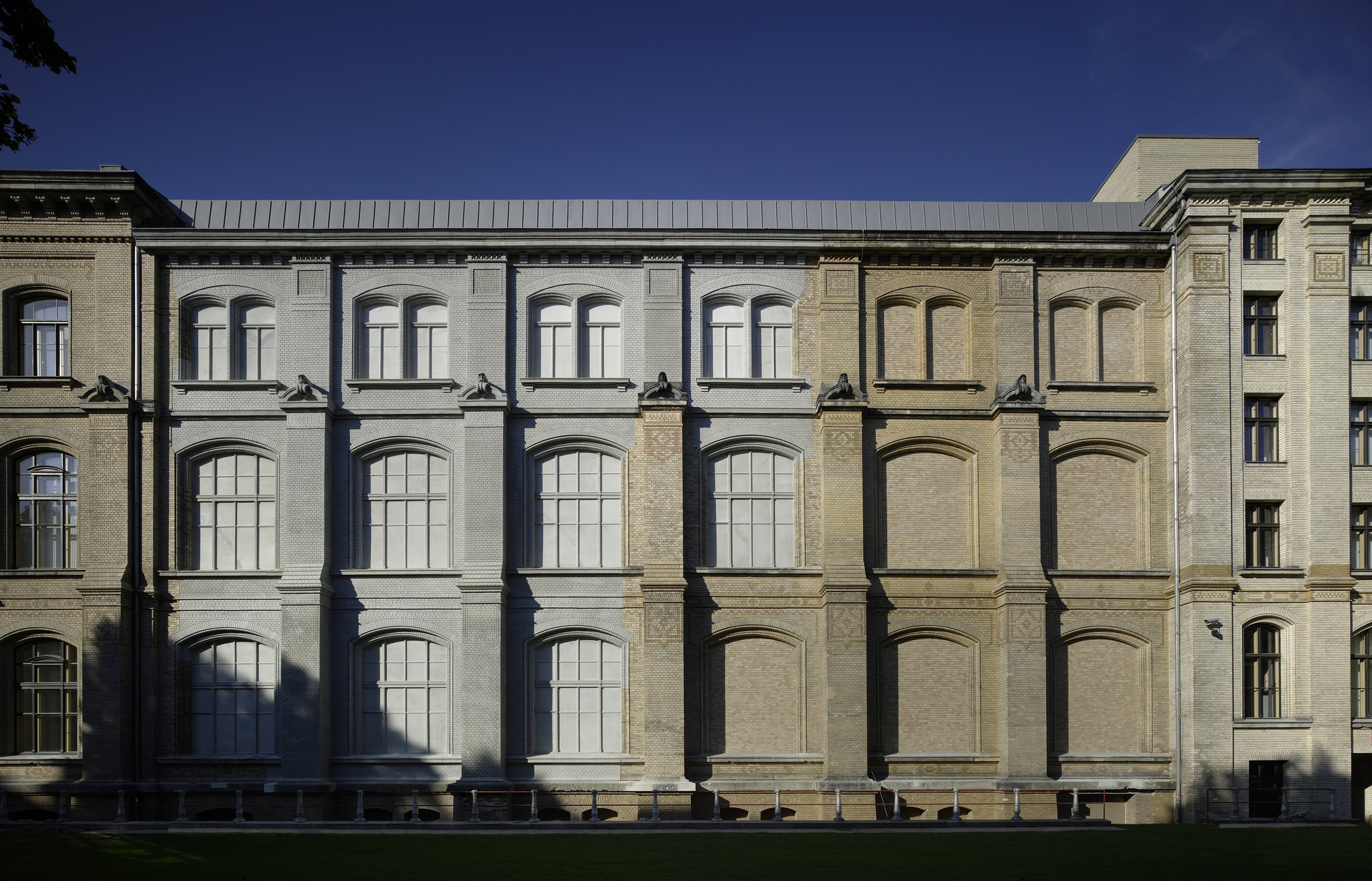 Weil die Exponate lichtempfindlich sind, hat der Raum keine Fenster. Flache Nischen in den mit dem kalten Rotpigment Caput mortuum gefärbten Wänden deuten die Lage der einstigen Fenster an. Zum westlichen Innenhof hin war die Fassade erhalten geblieben, zur anderen Seite hin gab es nur noch Mauerfragmente. Die flickten Diener & Diener nicht einfach, sondern ergänzten sie auf eine Art, die — besonders unter Architekten und Denkmalpflegern — für viel Aufmerksamkeit sorgt. Die erhalten gebliebenen Fensteröffnungen der gelben Ziegelfassade liessen sie zumauern, die Bombenlücke füllten sie mit Betonkopien erhalten gebliebener Fassadenteile. Wer nun durch den seitlichen Hof des Museums zu den hinteren Universitätsgebäuden geht, der erlebt ein irritierendes Schauspiel.
