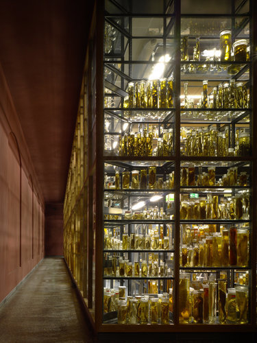 Die Architekten gingen aber noch weiter. Schon im Wettbewerb schlugen sie vor, im wiederaufgebauten Ostflügel einen der grössten Schätze der Sammlung zu präsentieren: die «Nasspräparate», rund 276 000 mit Alkohol gefüllte Gläser, in denen Fische, Reptilien oder Säugetiere unbeschadet die Zeit überstehen, zum Teil vor mehr als 200 Jahren von Humboldt selbst nach Berlin gebracht. Darunter finden sich viele «Typenexemplare», Tiere, die als Erste ihrer Art untersucht wurden und vielen internationalen Forschern noch immer als Vergleichsobjekte dienen. Roger Diener stiess mit seiner Idee einer saalgrossen Vitrine — wie sollte es anders sein — bei den Forschern zu Beginn auf Skepsis. Zu wertvoll der Schatz, zu kompliziert das Miteinander von musealer Einsehbarkeit, gesichertem Forscherzugriff und angemessener Lagerung, denn bei Temperaturen über 15 Grad verdunstet der Alkohol, legt die Präparate frei und droht sich zu entzünden. Schliesslich aber überzeugte die Idee und auch die Vorstellung, mit der Inszenierung der Präparate viel Volk anzulocken und ihm die wissenschaftliche Arbeit näher zu bringen.