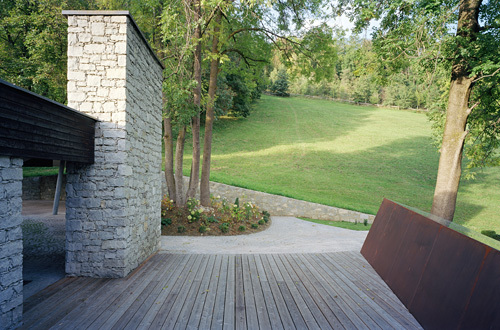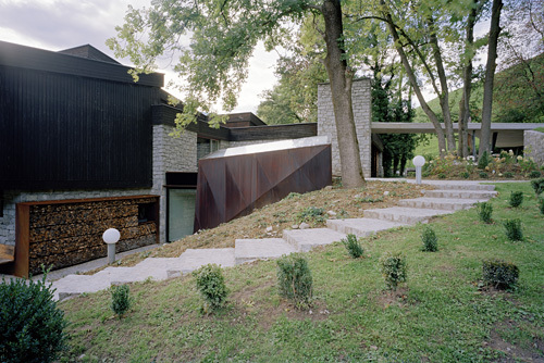 Ein direkter Ausgang, sowie Ausblicke durch Außentür und Oberlicht schaffen neue Außenbezüge vom Untergeschoß in den Garten. Oberirdisch bildet der außen mit Corten Stahl verkleidete Lichtkonus die Brüstung einer neuen Terrasse. Ein Regal aus demselben rostenden Stahl mit scheinbar schwebenden Holzstapeln ergänzt den Dialog von Vorgefundenem und Eingriff. (Text: Claudia Wedekind nach einem Text des Architekten)