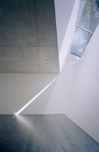 Das polygonal aufgefächerte Sichtbetondach des neuen Carports wird von geneigten Stahlrohrstützen getragen und berührt in einem Punkt die darunter liegende Mauer. Der bestehende Kubus wurde so mit neuen Fluchten ergänzt und zusammen mit dem neu modellierten Gartenweg eine organische Verbindung mit der Topographie geschaffen. Der gewünschte Lagerraum im Untergeschoss wurde in einen bestehenden Raum sowie in ein Möbelstück verlagert, um an dessen Stelle mit einer Diele den bestehenden, dunklen Gang zu belichten. Stark einfallendes Licht von oben beleuchtet eine geknickte, weiß lackierte Wand und erhellt den ansonsten weiß gestrichenen Raum. Seitenlicht und Oberlicht kommunizieren mit wechselnden Lichtreflexionen auf dem schwarzen Stahlboden.