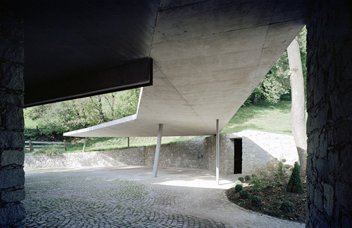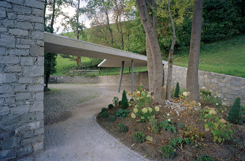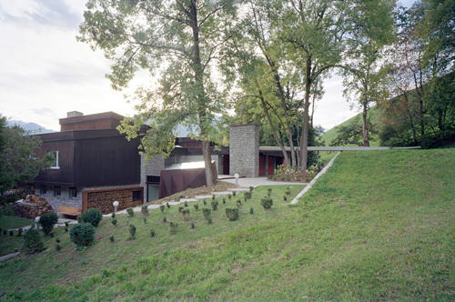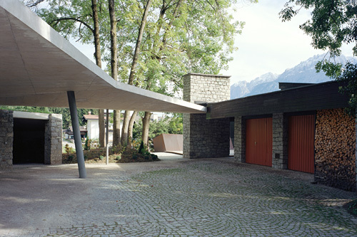 Ein bestehendes Wohnhaus aus der Mitte der 1970er Jahre (Planung: Rudolf Stotter) sollte um eine Garage für drei Autos sowie einen Kellerraum zur Lagerung von Bildern erweitert werden. Das Bestandsgebäude steht auf einem Grundstück am Übergang von stark geneigtem Gelände im Norden in eine ebene Fläche im Süden. Eingebettet in diesen Geländesprung erscheint das Haus im Norden eingeschossig mit Flachdach, während im Süden versetzte Pultdächer das Erscheinungsbild prägen. Der Zugang befindet sich im Norden und führt in das eigentliche Obergeschoss, wo sich neben einer Eingangsdiele der Hauptwohnbereich, ein Arbeitsbereich, der Eltern-Schlafbereich mit Bad sowie eine Doppelgarage befinden. Im Untergeschoss liegen im Osten und Westen jeweils Schlafbereiche mit Bädern, in zentraler Lage ein Schwimmbad sowie Abstellräume im Norden. Der verbindende Gang war aufgrund der Hanglage dunkel.Wesentliches Anliegen von rpaX war es, einen Dialog zwischen Bestand und Zubau herzustellen und trotzdem eigenständige Qualitäten im Neuen zu entwickeln und mit einer eigenen „Handschrift“ zu agieren. Die vorgefundene Großzügigkeit war für die Konzeption der Eingriffe genauso von Bedeutung, wie Atmosphäre, Material-Verwandtschaft und Reduktion. Ausgehend von der landschaftlichen Situation im Norden des Hauses sollte die lange Zufahrt nicht in einer Garage enden, sondern ein möglichst „leichtes“ Dach so an den Bestand gesetzt werden, dass ein Eingangshof entsteht, ein gedeckter Zugang zum Haus gewährleistet wird und der Blick in die Landschaft erhalten bleibt.