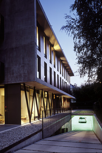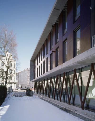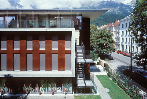 Blockränder im Osten und Stadtvillen im Westen prägen das Straßenbild der Conradstraße im Stadtteil Saggen. Zwischen die entstehungszeit-typischen Villen schiebt sich ein Gebäude ins Blickfeld, welches auf den ersten Blick „aus dem Rahmen fällt“. Anstelle einer der Straße zugewandten, repräsentativen Eingangsfront mit Haustor bildet eine stählerne Struktur für Stiege und Aufzugsturm die Schaufront dieses Neubaus. Materialien wie rostiger Stahl, Sichtbeton und Glas atmen das architektonisch Atmosphärische eines, durchaus in positivem Sinn gemeinten, Zeitgeists.Nicht, dass der Entwurf von Anfang an nur Zustimmung erfahren hätte, wird er doch anfangs durch die Stellungnahme des „Sachverständigenbeirats nach dem Stadtkern- und Ortsbildschutzgesetz“ beeinsprucht. Erst ein dieser Stellungnahme widersprechendes Gutachten des Autors dieser Zeilen bildet u. a. die Grundlage für den positiven Baubescheid: „Dem Wunsch des Architekten, gegenüber der verkehrsreichen Conradstrasse einen Lärmpuffer in Form einer geschlossenen Wand mit vorgestellter Vertikalerschließung auszubilden, kann sich der Gutachter im Sinne einer Anpassungsverweigerung zugunsten eines kontrapunktischen, architektonischen Akzentes anschließen. Die unter einem ausladenden Dach zusammengefasste Stiegen- und Aufzugskonstruktion widersetzt sich nach Meinung des Gutachters nicht einer harmonischen Gesamtschau des Straßenbildes, diese ist das Ergebnis lebendigen Baugeschehens über verschiedene Zeitabschnitte hinweg. Der geschoßweise schlüssig strukturierte Baukörper signalisiert in qualitätsvoller Weise „Neues Bauen“ in historischer Umgebung“.