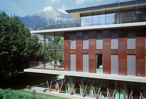 Peter Lorenz, neugierig und ohne Berührungsängste gegenüber Neuem, setzt mit diesem transparenten Bau und dessen weit ausladenden Terrassen mit hohem Wohnwert ein Zeichen zeitgemäßen Bauens im Saggen. Die das Volumen tragenden V-Stützen im Erdgeschoß erinnern an einen Tausendfüßler, der den Anschein erweckt, als würde er sich jeden Moment fortbewegen. Diese scheinbare Mobilität kann als Symbol der dauernden Veränderung neuer Architektur gelesen werden.
