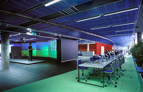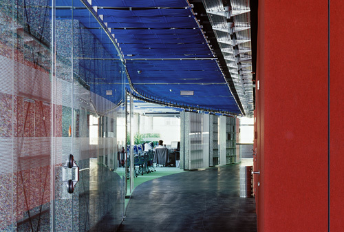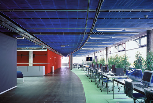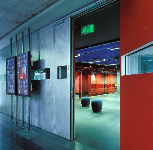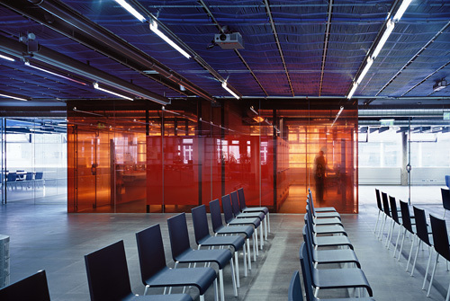 Die kreativen Kapazitäten sollen durch neue ungewöhnliche Materialien und Konstruktionen und überraschende räumliche Effekte angeregt werden. Um den gesuchten Werkstattcharakter zu erzeugen, wurde in Zusammenarbeit mit der Firma Lindner das Standardprodukt Anhydridträgerplatte weiterentwickelt. Die Platte wurde in der Produktion antrazith durchgefärbt und massenhydrophobiert. Nach einer örtlichen Oberflächenverhärtung konnte die Doppelbodenplatte somit als neuartiger, fertiger Fußboden verwendet werden. Für Trennwände und Mobiliar kamen verschiedene Recycling-Kunststoffplatten zum Einsatz, roter Akustikfilz als Wandbelag, ein grüner Freiluftsportbodenbelag und transluzente Glasboxen etwa für die Nass-Räume prägen den Charakter des Innenraums.