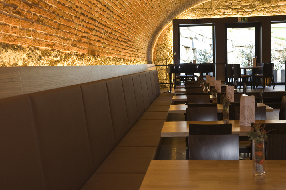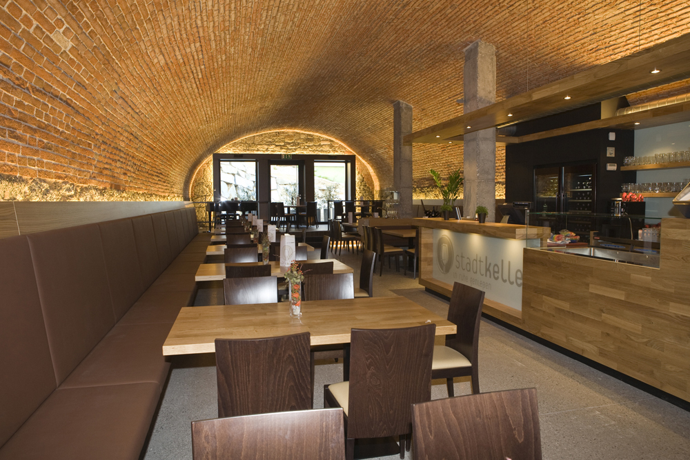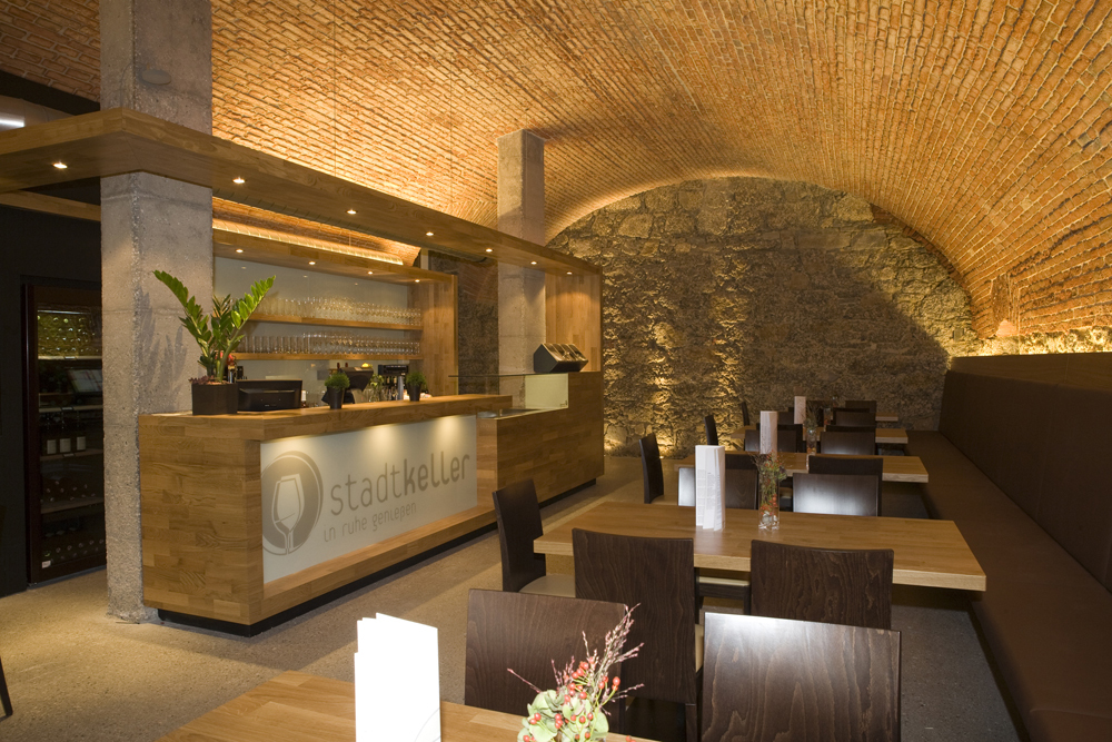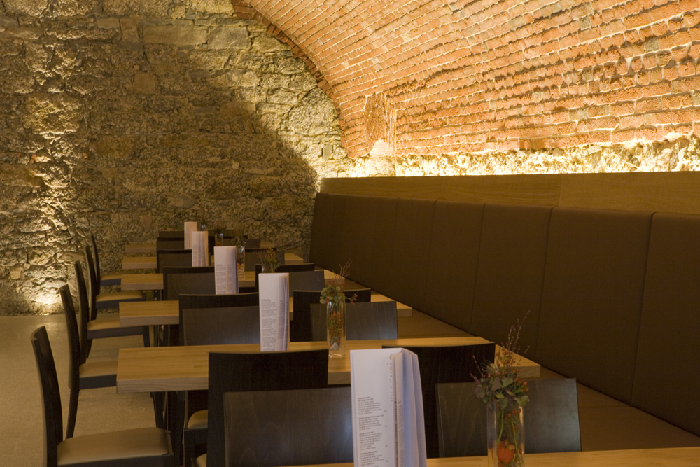 Der ehemalige Eiskeller wurde technisch anspruchsvoll und bis ins Detail gefühlvoll saniert.Möbel und indirekte Beleuchtung setzen den tiefen Gewölberaum anschaulich in Szene.