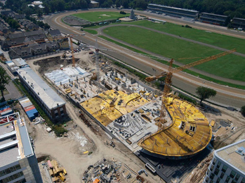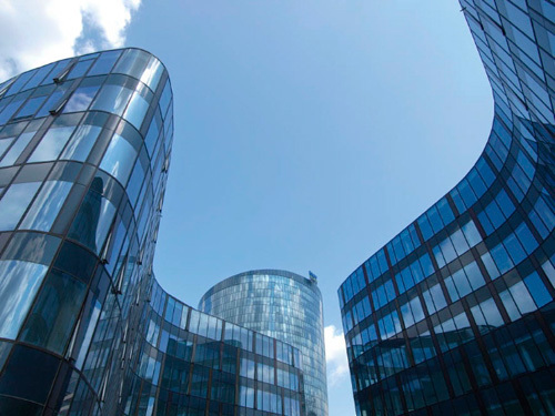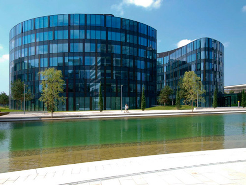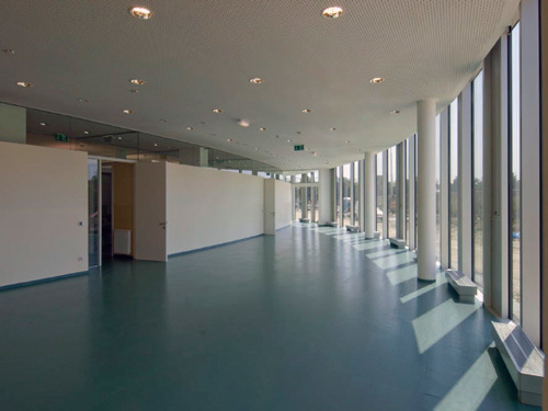 Die vier Baukörper sind mit vier bis sieben Stockwerken höhenmäßig differenziert. Die Architekten haben für die vier „Kipferln“ die gekrümmte Form vom Hochhaus am Areal aufgegriffen. Die Krümmung führt dazu, dass die unbelichteten Flächen im Gebäudeinneren auf ein Minimum reduziert werden. In einem der Baukörper befindet sich im Erdgeschoß ein Kindergarten. Auch hier profitieren die Kinder vom hohen Tageslichtanteil. Für die Fassadengestaltung haben die Architekten mit Ursula Aichwalder zusammengearbeitet. Die Farbgebung wirkt selbstverständlich und ist Ergebnis einer intensiven Auseinandersetzung mit dem Spiel von Licht und Reflexionen. (Text: Martina Frühwirth)