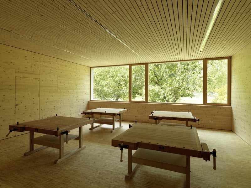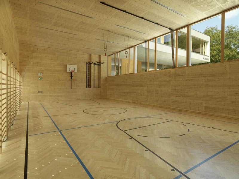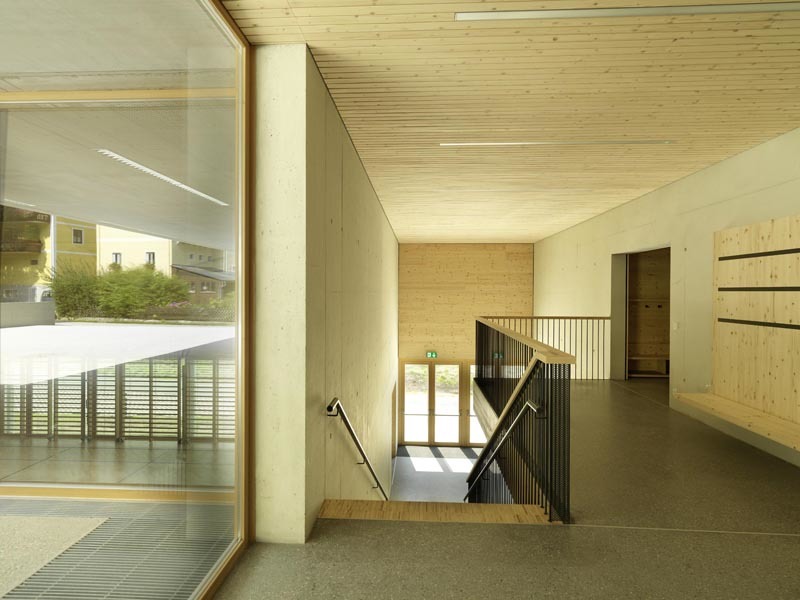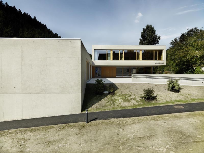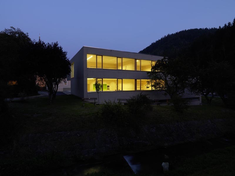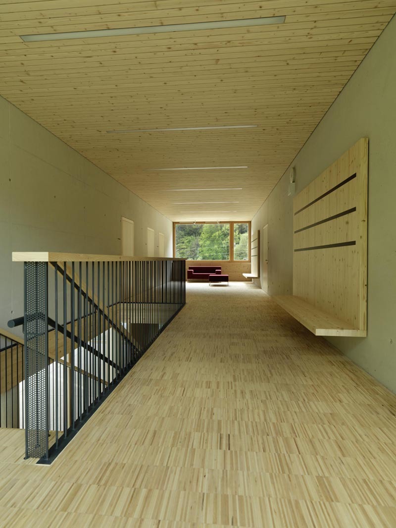 Der Baukörper ist in seiner äußeren Erscheinung auf Sichtbeton und Glas reduziert und gibt sich unprätentiös und zurückhaltend. Gleichermaßen wie die Fassaden nach außen kühl wirken, beeindrucken die Innenräume durch ihre warme Ausstrahlung. Im Innenausbau wurde konsequent mit Holzoberflächen gearbeitet, wobei darauf Wert gelegt wurde, Tannenholz aus der Region zu verwenden. Decken, Innenwände und Möbel wurden aus eigens dafür entwickelten Dreischichtplatten gefertigt, einzig die Industrieparkettböden aus Esche bilden eine Ausnahme. Das Gebäude erfüllt den Niedrigenergiehaus-Standard und wird über ein benachbartes Nahheizwerk versorgt. (Text: Martin Brischnik)