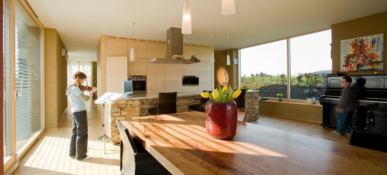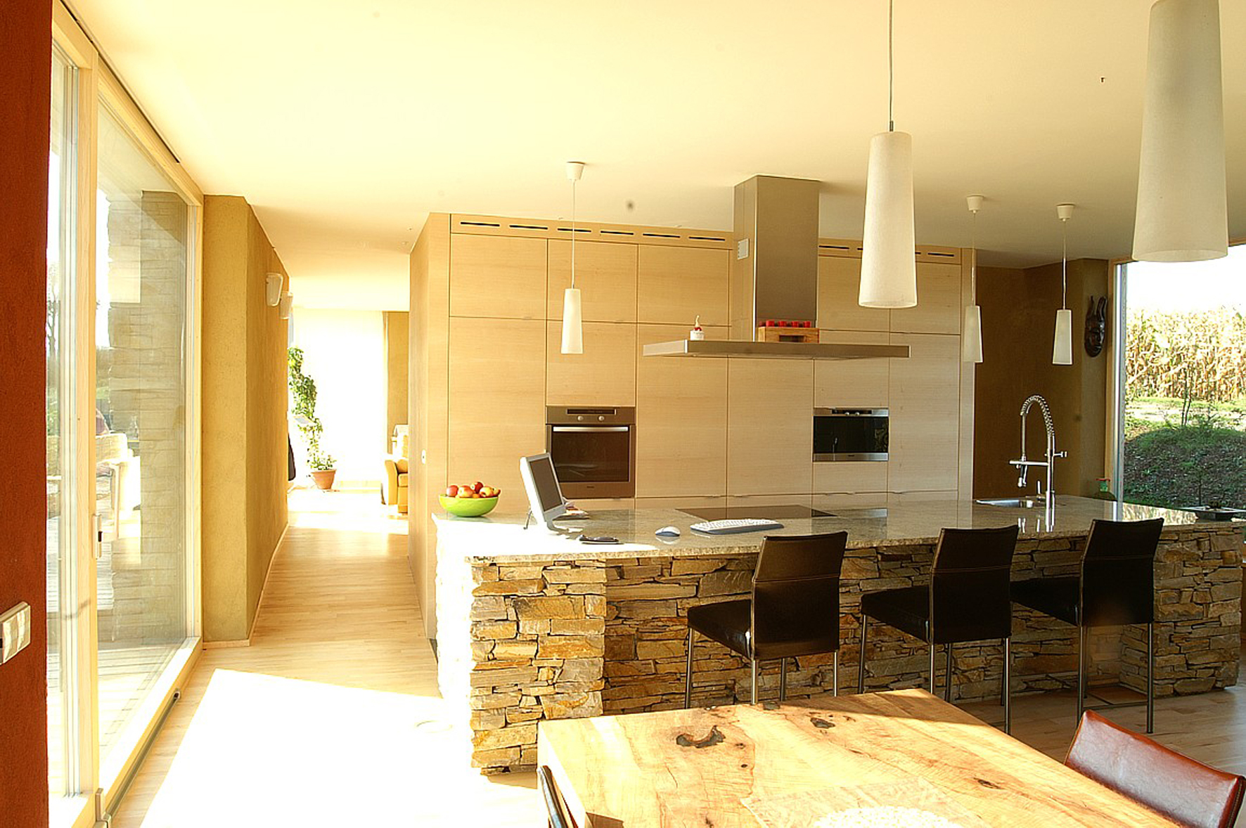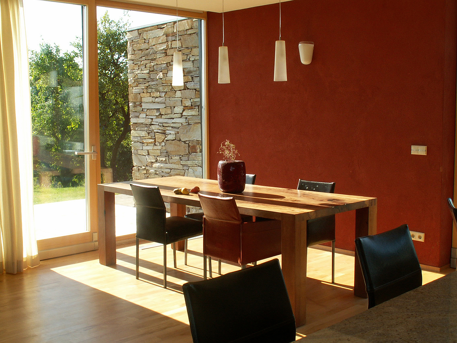 Der Innenraum ist geprägt vom Einsatz von Lärchen- und Ahornholz, sowie dem in gelb bzw. rot gehaltenem Lehmputz; außen mit einer naturbelassenen Lärchenholzfassade und Lärchenholzterrassen sowie zwei Natursteinwänden, die das Obergeschoss optisch tragen. Die Haustechnik ist bewusst sehr schlank gehalten und besteht einzig aus einem Kompaktgerät, das das Lüftungsgerät einen Warmwasserspeicher und die Wärmepumpe beinhaltet. Die Vorkehrungen für einen späteren Anschluss von Warmwasserkollektoren am Dach wurden getroffen.