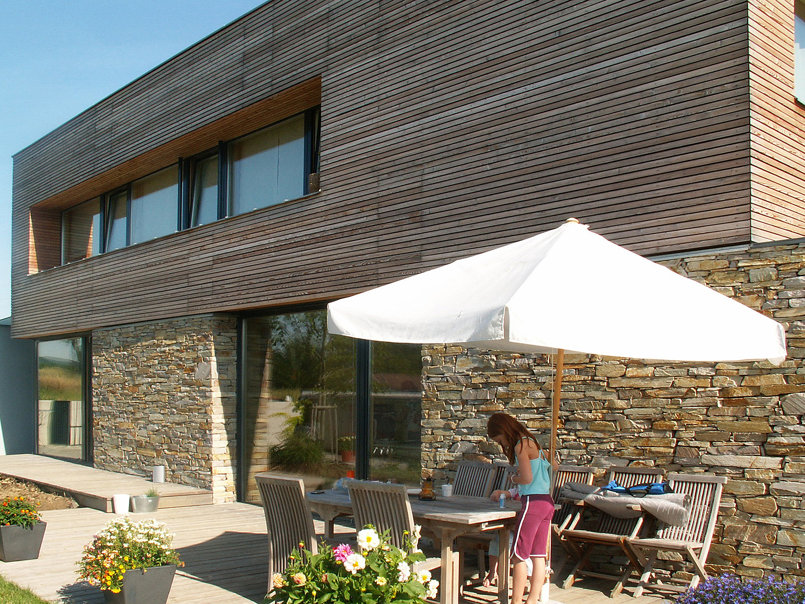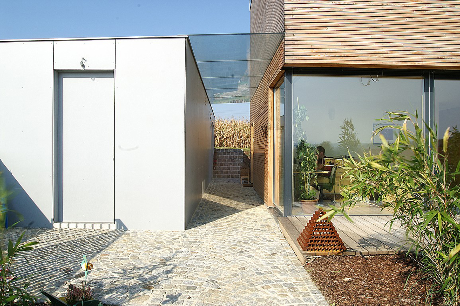Das zweigeschossige Wohnhaus erstreckt sich in Ost-West Richtung, ist sehr kompakt und weist einen für den Holzbau ökonomischen Konstruktionsraster bzw. -spannweiten auf. Keine Vor- oder Rücksprünge stören das ausgewogene Oberflächen/Volumenverhältnis. Eine eingeschossige Nebenraumzone an der westlichen Grundstücksgrenze erstreckt sich von Süd nach Nord und umschließt den Hauptbaukörper. Dadurch wird das Haupthaus in das Umfeld integriert und verankert. Es entstehen gegliederte und blickgeschützte Außenräume. Beginnend von der Straße wird der Bewohner von der Zufahrt über das Carport, einer Sitzecke unterm Kastanienbaum, dem Weinkeller und der Werkstatt ins Haus geführt.