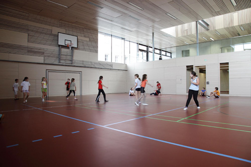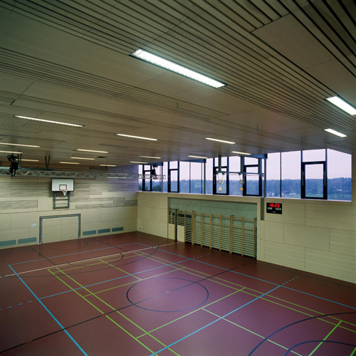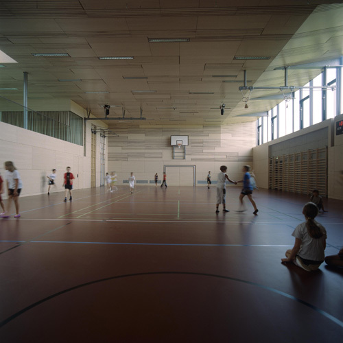 Die Kellerräume der bestehenden Volksschule wurden geöffnet und verschmelzen mit dem Neubau zu einer Einheit. Die Wandflächen des Turnsaales sowie die durchgehende Decke von Saal und Foyer sind einheitlich mit hellem Eschenholz ausgekleidet, um dem Turnsaal auch das für Veranstaltungen ein entsprechendes Ambiente zu verleihen. Einbauten wie Turngeräte, Lüftungsöffnungen und Leuchten werden mit einer zusammenhängenden Struktur aus Platten und Brettern kombiniert, wobei die fließenden Übergänge exakt den akustischen Anforderungen entsprechen.