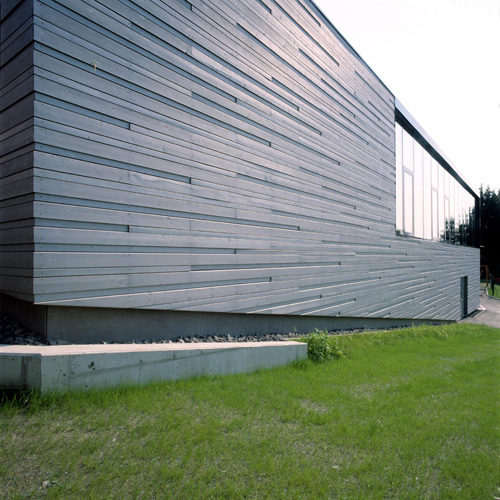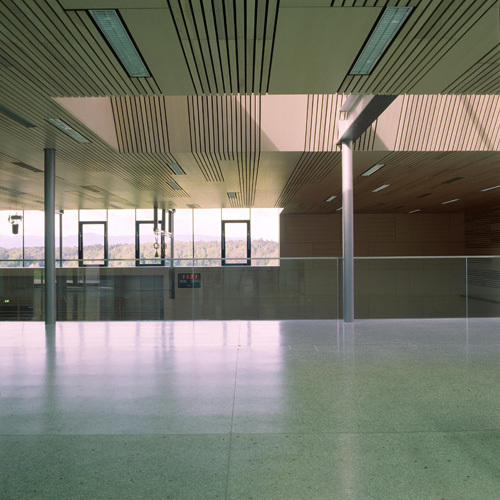 Als Bindglied zwischen der bestehenden Schule und dem tieferliegenden Mehrzwecksaal fungiert das Foyer, das zum kommunikativen Zentrum für den ganzen Ort geworden ist: Während der Schulzeit als heller Pausenraum für die Schüler, mutiert der Raum abends und am Wochenende zum einladenden Treffpunkt. Das Foyer wird dann zur Tribüne, von der man die Geschehnisse im Saal überblicken kann. Gleichzeitig bieten große Fassadenöffnungen gezielte Aus- und Durchblicke in die Landschaft.