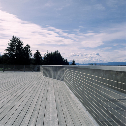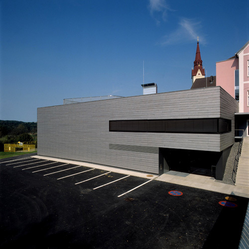 Alle fünf Außenflächen sind mit Lärchenholz verkeidet, 750 m² Holzterrasse am Dach bieten mit dem Weitblick bis zur Koralm ein unvergleichliches Ambiente sowohl für die Volksschule als Freiklasse, als auch als Deck für Veranstaltungen aller Art. (Text: Ute Angeringer-Mmadu)