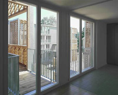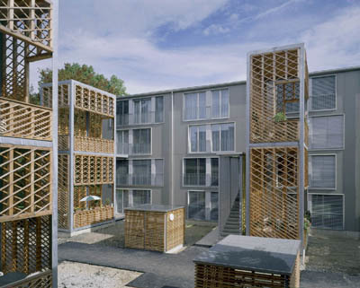Das Besondere an der Siedlung sind jedoch die zweigeschossigen Laubentürme, die als Gartenersatz zwischen den Häuserzeilen stehen. Die schlichten Stahlkonstruktionen evozieren mit ihren Ausfachungen aus kreuzweise diagonal angeordneten Lärchenholzleisten Bilder traditioneller Gartenarchitekturen, obschon sie in dieser Form neuartig sind. Sie lösen das Problem des privaten Aussenraums in einer stark verdichteten Überbauung und verleihen dieser einen unverwechselbaren Charakter. Hier zeigt sich die Stärke des Architekten Frank Zierau. Er entwickelt seine Entwürfe frei von Ideologien, streng bezogen auf Funktion und Benutzer. Dabei geht er die Entwurfsprobleme offensiv an, was zu unkonventionellen, innovativen Lösungsansätzen führt.
