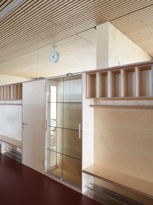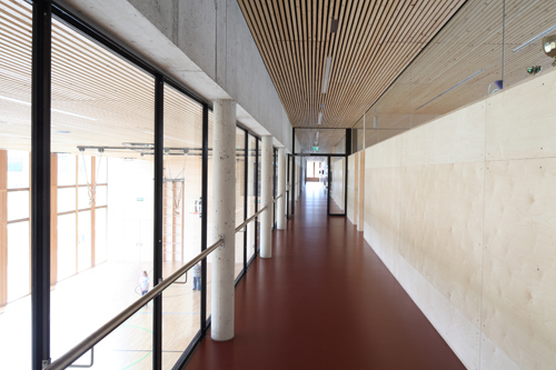 Das Ambiente des Innenraumes wird geprägt durch den durchgängigen Einsatz von Birkensperrholz aus dem die Wandverkleidungen und das eigens für das Schulzentrum entworfene mobile Möbelsystem gefertigt sind. Heimische Tischlereien setzen die hohen handwerklichen Anforderungen auf höchstem Niveau um. Der Gang ist gleichzeitig Pausenraum. Durch das durchgehende Oberlicht entsteht der Eindruck eines noch größeren lichtdurchfluteten Raumes. Das Tafelsystem wird komplett neu entwickelt und auf die Bedürfnisse der Lehrer und Schüler abgestimmt. Die Sideboards sind auf Räder gestellt, sodass sie jederzeit frei im Raum aufgestellt werden können.