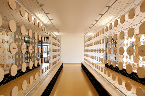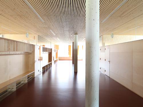 Der Mehrzwecksaal ist Turnsaal, Bewegungsraum für Nachmittagsbetreuung und Veranstaltungssaal in einem. Mit seiner hinter großen Schiebeelementen versteckten großzügigen Bühne, dem multifunktionalen Bühnennebenraum und dem angrenzenden Foyer ist er auf rasch auf alle erdenklichen Bespielvarianten adaptierbar.