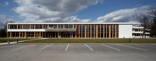 Der neue Eingang der Hauptschule wird vom transluzenten Flugdach bestimmt, dessen künstlerische Gestaltung von Werner Hofmeister stammt. In der Hauptschule wird die Fassade thermisch saniert und die Fensterstruktur an den Neubau der Volksschule angeglichen um den Lichteinfall zu verbessern. Dadurch entsteht ein einheitliches Gesamtbild des Schulzentrums. Es ist nun gar nicht mehr so einfach, neu von alt zu unterscheiden. Die vertikalen Holzelemente in der Fensterebene verleihen dem alten Betonbau eine neue Leichtigkeit, indem sie die massiven Stützen integrieren und auf diese Weise optisch verschwinden lassen. Die horizontalen Betonbalken in den Fensteröffnungen des Altbaues werden abgetragen, die senkrechten Fensterteilungen integriert. Durch Öffnung zweier Räume bis zur Fassade entsteht eine völlig neues, lichtdurchflutetes Ambiente.