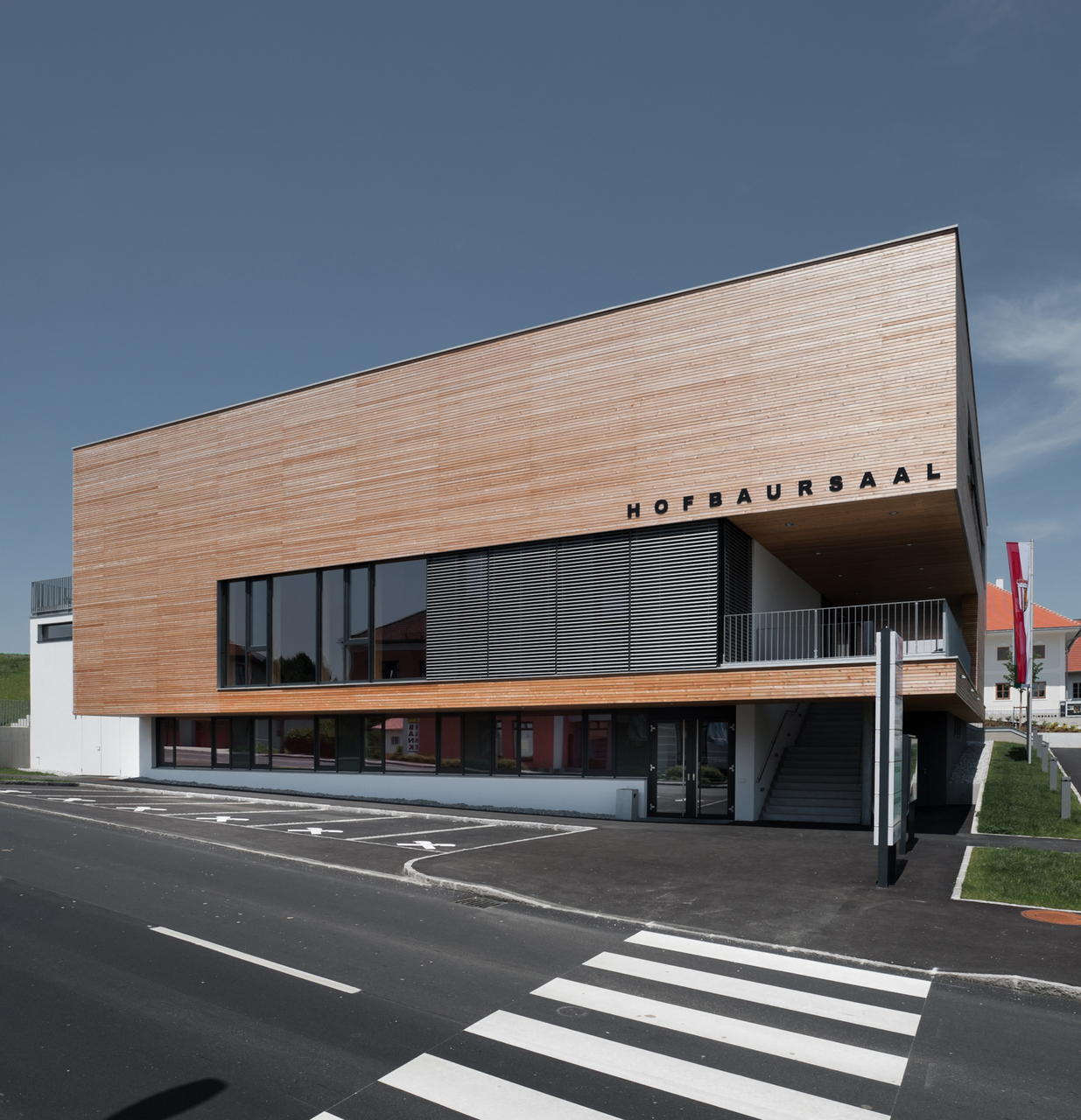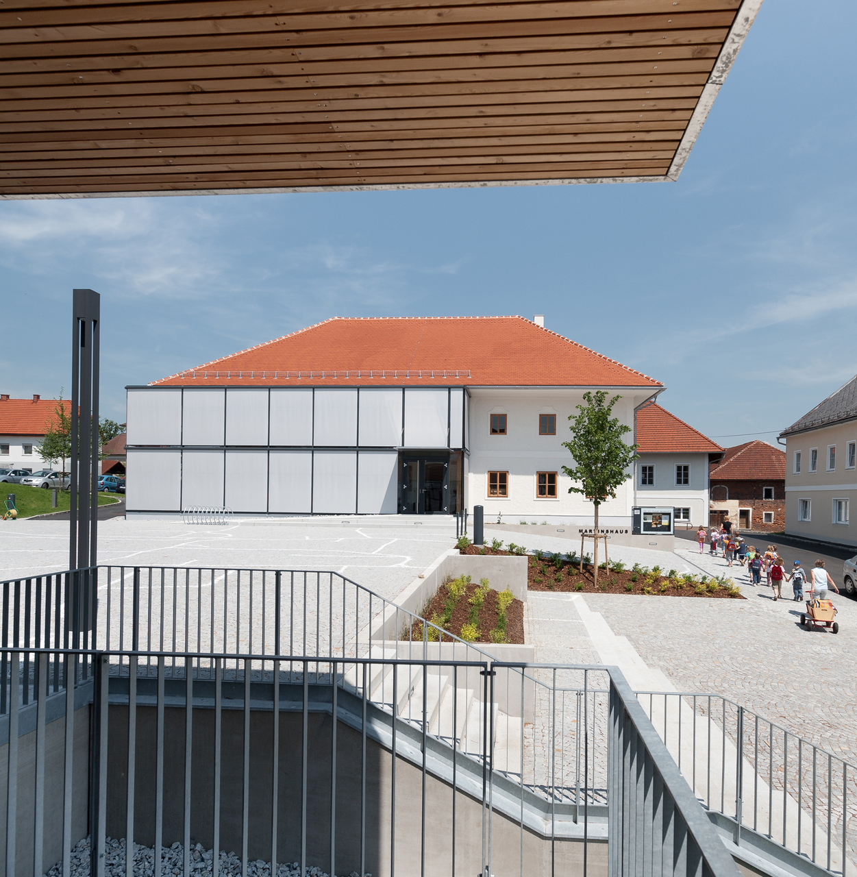 Das Musikheim im Untergeschoß ist von der Straße her zugänglich, die im Obergeschoß gelegenen Amtsräume der Gemeinde vom Parkplatz hinter dem Presshaus. Der Veranstaltungssaal mit seinen Nebenräumen und das zum Nahversorger aufgewertete Kaffeehaus auf der mittleren Ebene aber öffnen sich zum Platz. Die Vielfalt der Räume wird im Inneren des Hauses vom Lichtraum der Stiege zu einer Einheit verbunden, die über gezielt gesetzte Öffnungen stets den Ort im Blick behält.