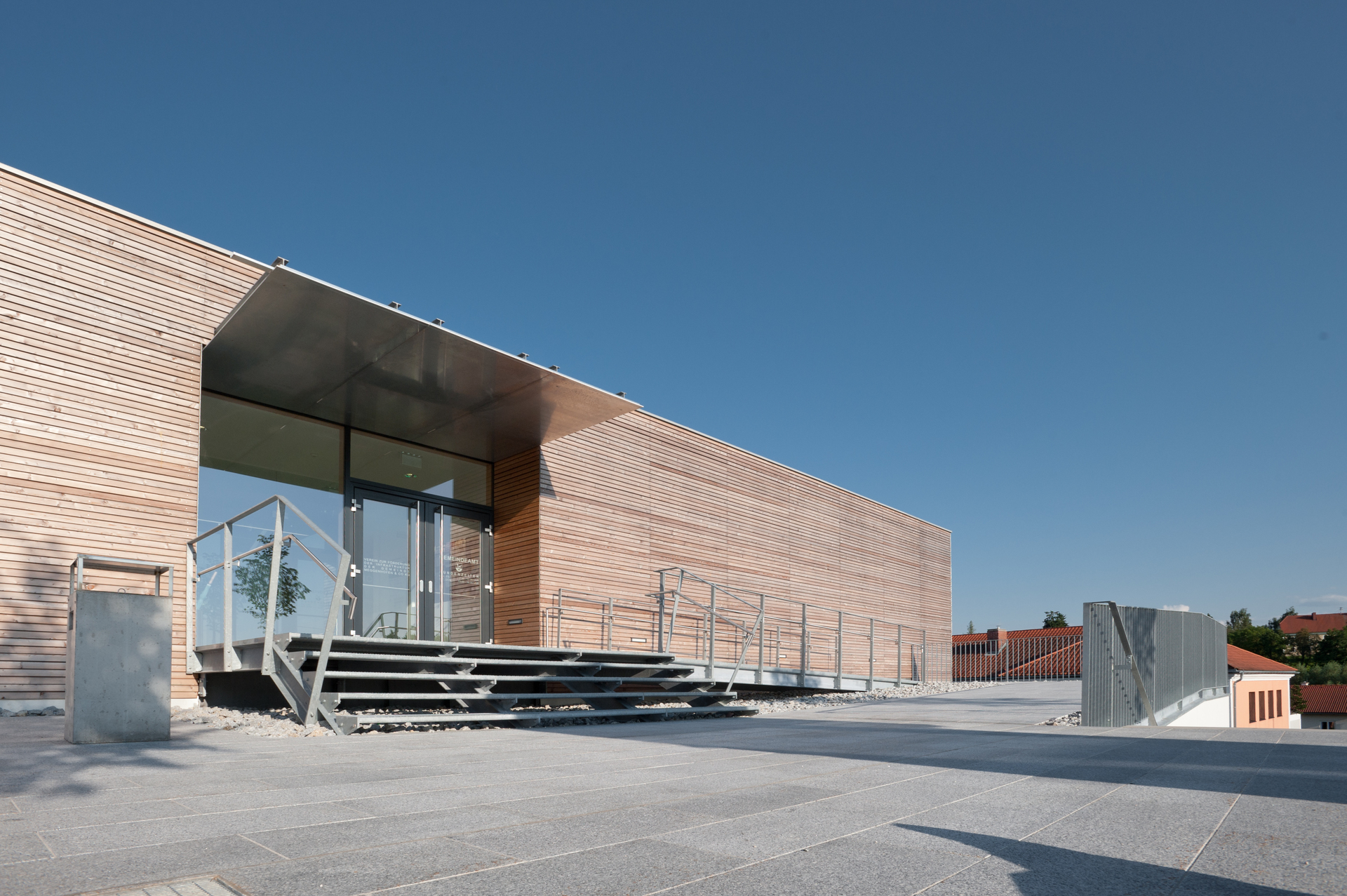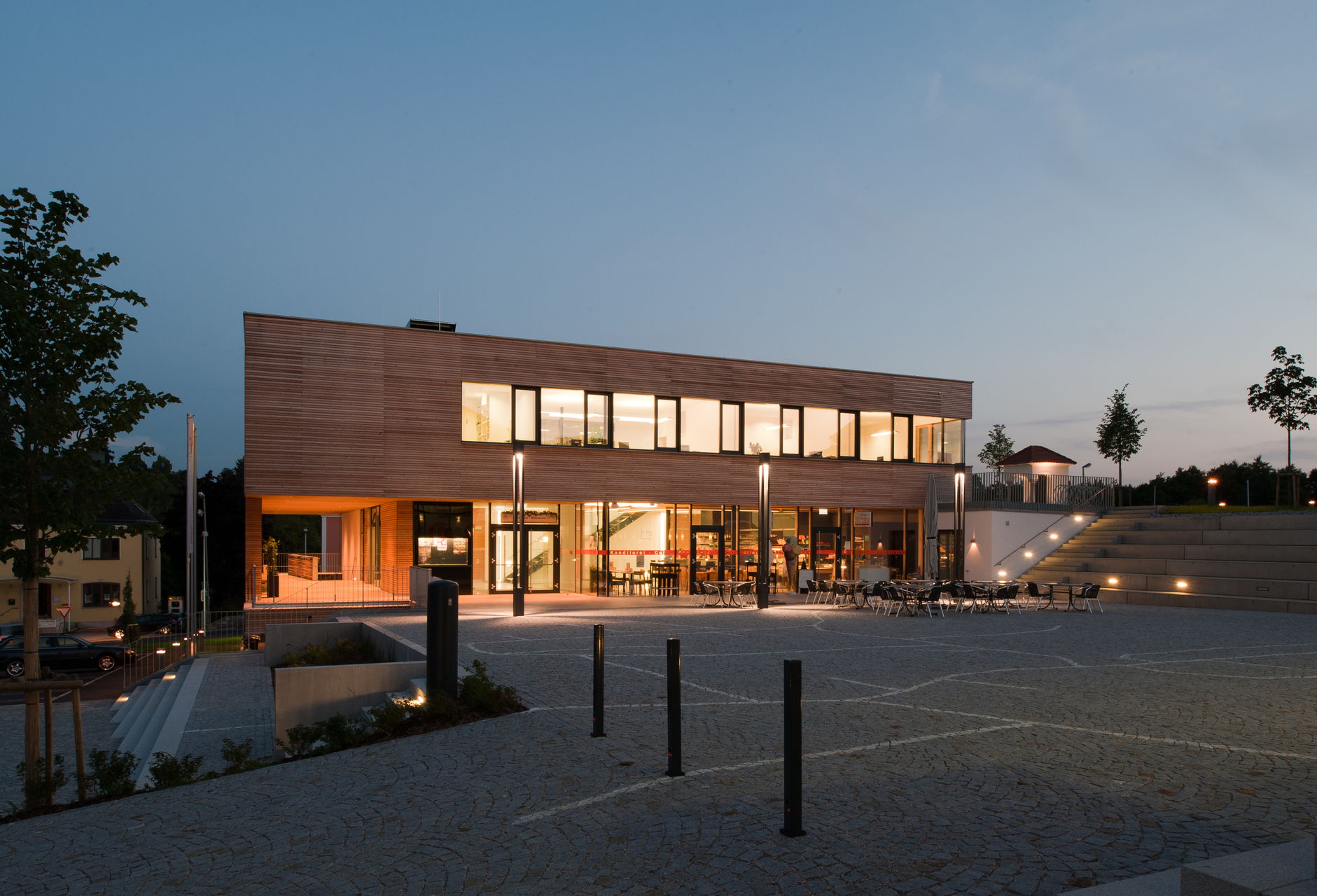 Die architektonische Erscheinung der Fassade in Holz soll den konstruktiv verwendeten Baustoff nach außen transportieren. Eine größtmögliche Transparenz soll ein einladendes und offenes Amtgebäude darstellen und Durchblicke zur Kapelle und zur Kirche sowie auf den neuen Ortsplatz ermöglichen.