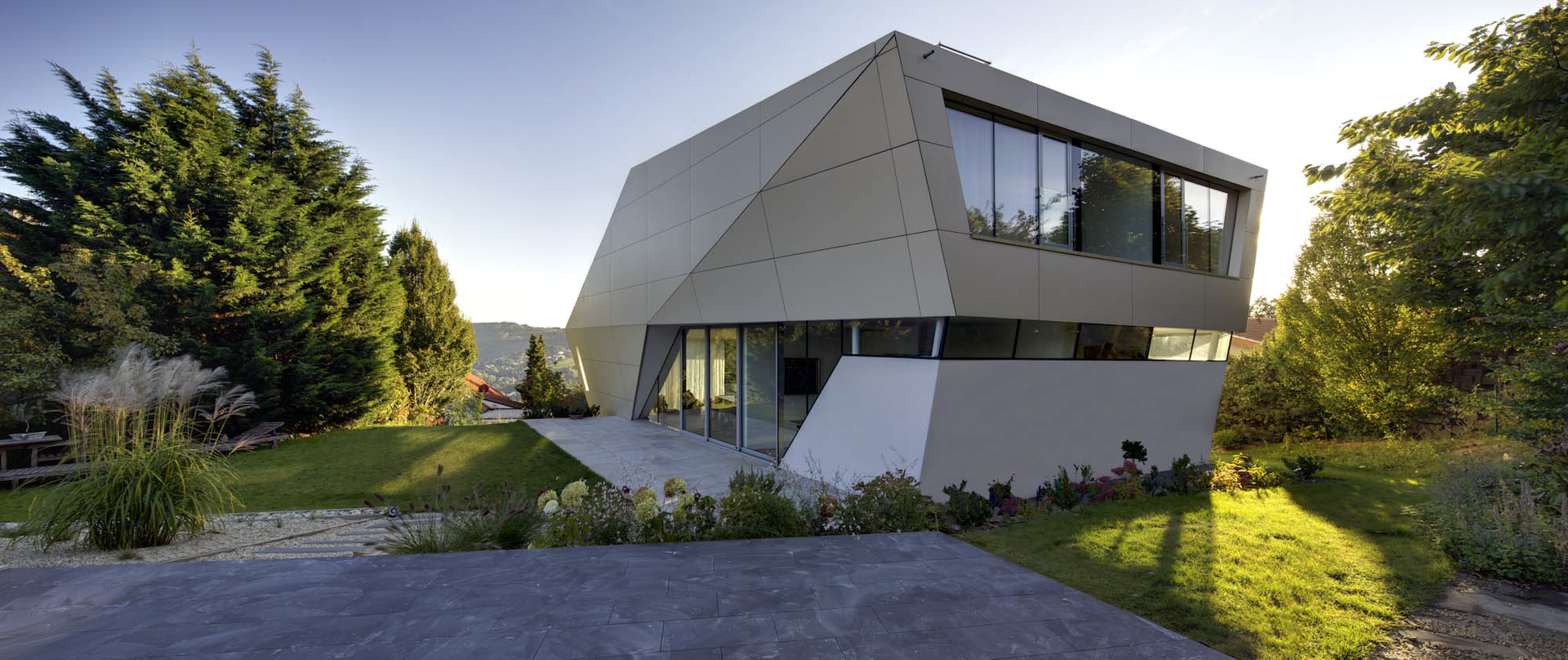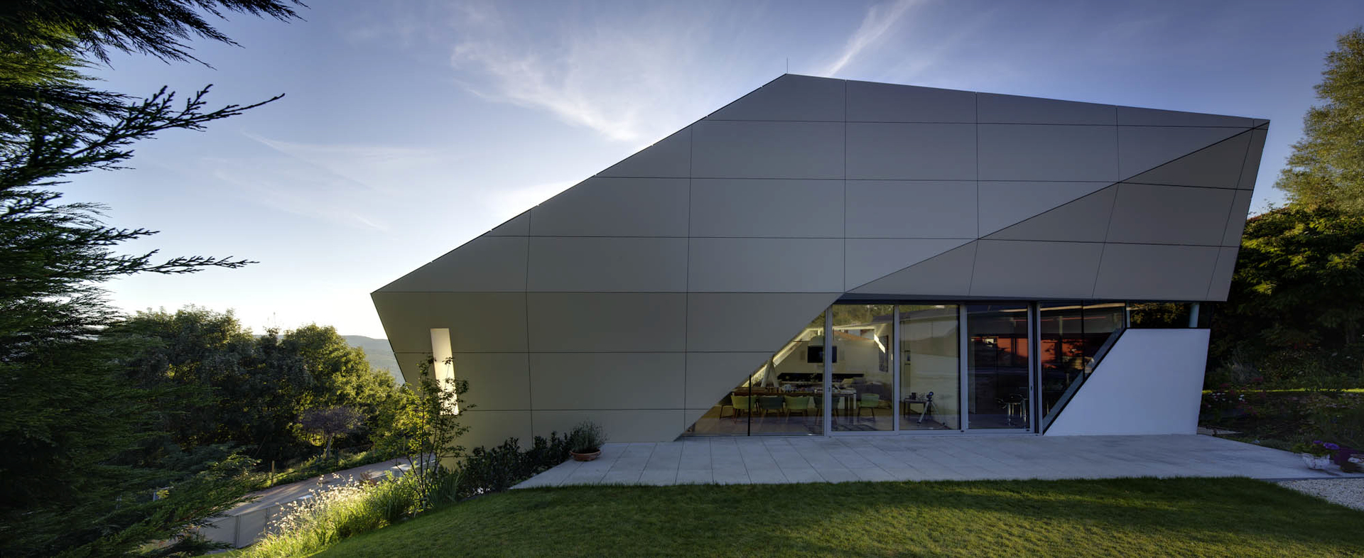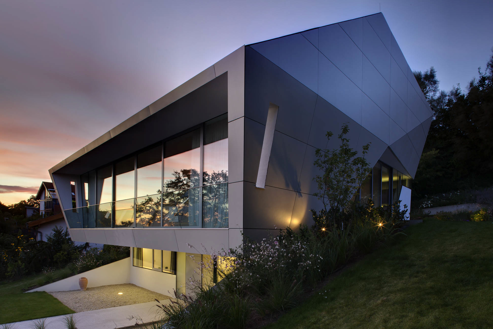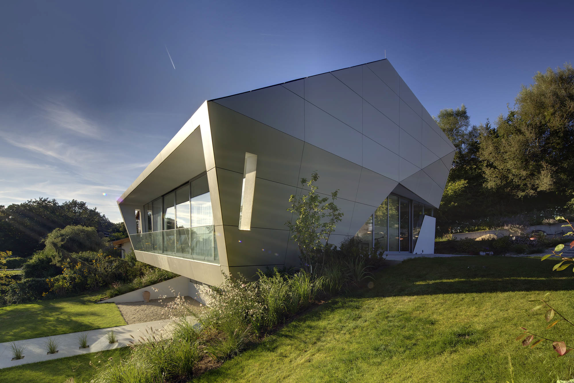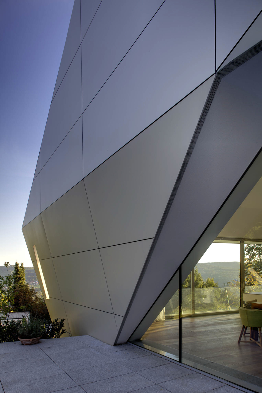 Ein Periskop, das über dem Grundstück schwebt und entlang der Böschung nach unten abbricht. Dahinter liegt der Wohnraum. Wie ein Trichter öffnet er sich nach Süden. Durch die gekippte Glasfassade genießt man wie von einem Cockpit aus die Landschaft. Knapp vor der Panoramascheibe führen zwei Stufen abwärts. Sie laden ein, Platz zu nehmen.