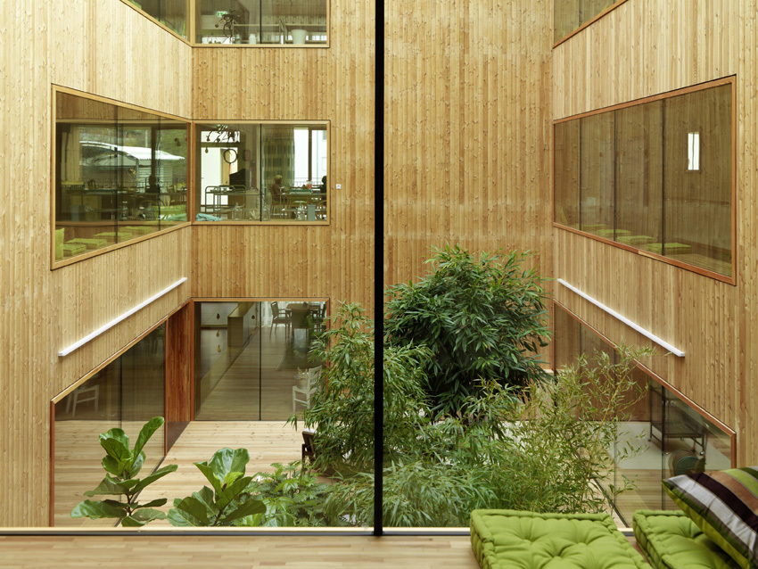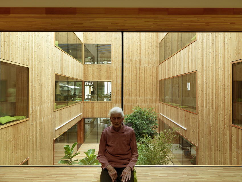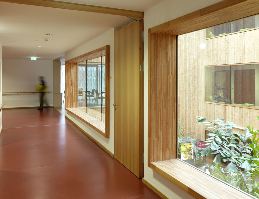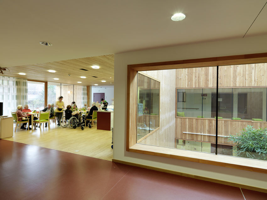 Wie setzt man ein Pflegeheim mit 81 Betten so in eine bestehende Wohnsiedlung am Stadtrand, dass kein Abstandsgrün, sondern sinnvoll nutzbare Außenräume entstehen? Wie macht man die umgebende Landschaft für Bewohner erlebbar, die oft ihr Bett nicht mehr verlassen können? Wie gelingt es, in einem so großen Haus eine familiäre Atmosphäre entstehen zu lassen? In diesem Projekt wurde ein Typus gefunden, der hohe Effizienz mit hohen räumlichen Qualitäten verbindet, die sowohl den BewohnerInnn als auch den Betreuer:innen zu Gute kommen.Auf jedem Geschoß befinden sich zwei Wohngruppen mit je 13 Zimmern, die sich jeweils um einen überdeckten Innenhof und eine offene Küche gruppieren. Der Schwesternstützpunkt liegt an der Schnittstelle zwischen diesen Einheiten, was für kurze Wege sorgt und es den Betreuer:innen erleichtert, im Team zu arbeiten. Den dementen Bewohner:innen soll hier ein angstfreies, so weit wie noch möglich selbst bestimmtes Leben ermöglicht werden, das die individuellen Biographien respektiert. Die Architektur bietet dafür einen beruhigenden Rahmen, der im Inneren in Material und Atmosphäre überzeugt, nach außen aber sedierter wirkt, als es an diesem Ort nötig wäre. (Jurytext aus: Kärntner Landesbaupreis Kärnten 2010 - Much Untertrifaller, Tom Lechner, Christian Kühn, Gerhard Kresitschnig, Bernhard Wohlmuther)