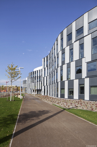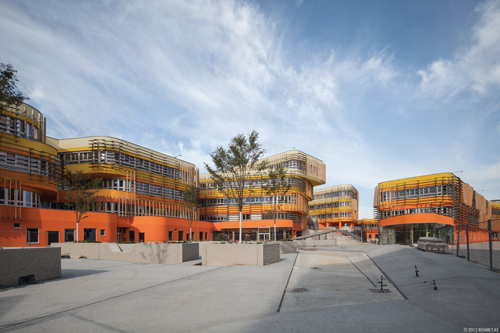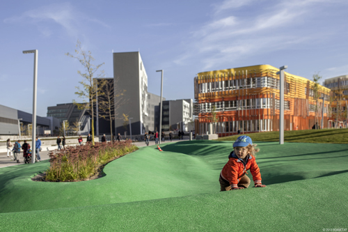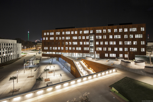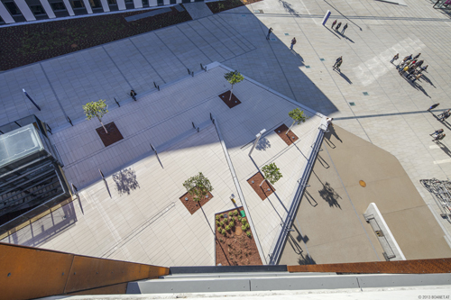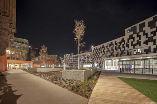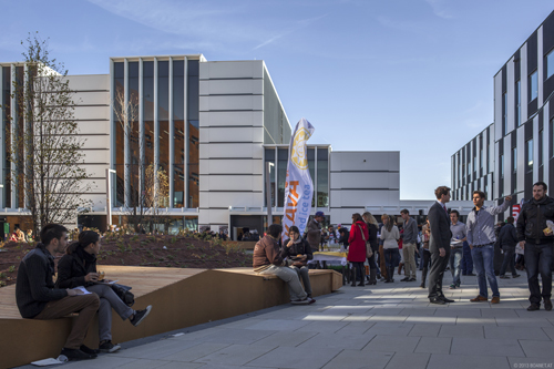 Das räumliche Zentrum am Campus bildet der „Stage Platz“. Die enorme Freifläche von fast 4.000 m² spannt sich vor dem Library & Learning Centre auf. Der Platz wird seinem Namen gerecht, indem der Freiraum zur Bühne wird. Die vorbeigehenden Menschen ziehen die Blicke auf sich. Keine Bühne ohne Publikum! Die Zuschauer finden sich hier auf den Tribünen, die den Platz einfassen und zum Sitzen und Schauen einladen.
