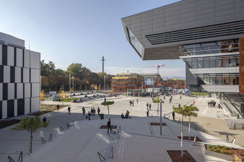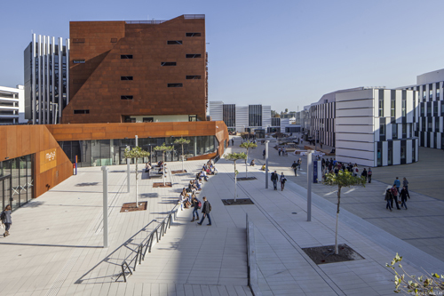 Der „Patio Platz“ ist im Teaching Center integriert und verbindet die Selbststudienzonen im oberen Bereich des Sockels mit den Plattformen der Mensa-Terrasse und den Sitzstufen zur Fußgängerzone der Transversale.