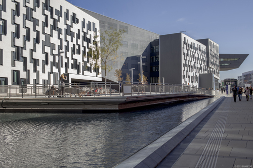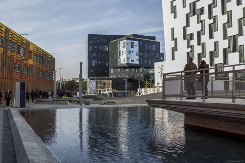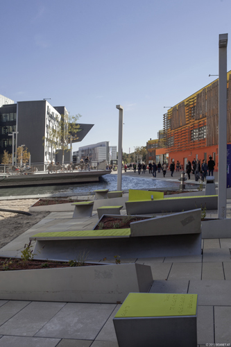 Flaniert man weiter, gelangt bald man zum „Expo Platz“. In leicht erhöhter Lage bietet die besonnte Plattform mit Blick auf das Wasserbecken Platz für Gruppen, die hier gemeinsam arbeiten. Die Bäume müssen noch ein wenig zulegen, dann werden sie Schatten spenden, damit die Lernenden einen kühlen Kopf bewahren. Der „urbane Balkon“ bietet einen guten Überblick über das Geschehen am Campus.