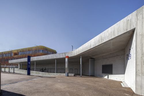 Die Hauptachse wird von den sechs freistehenden Gebäuden flankiert bzw. gerahmt und ist den Fußgängern vorbehalten, denn der Campus ist Fußgängerzone. Für den Radverkehr steht die außenliegende Umfahrungsschleife zur Verfügung. Abzweigungen führen zu den einzelnen Baukörpern, wo überdachte Abstellanlagen bereitstehen. Die strikte räumliche Trennung von Fußgängern und Radfahrern im zentralen Bereich scheint auf den ersten Blick unzeitgemäß. Bei näherer Betrachtung zeigt sich, dass diese Entscheidung richtig war. Zum einen steht den Radfahrer:innen mit direkten Zufahrten zu den Gebäuden und überdachten Abstellanlagen ein attraktives Angebot zur Verfügung, zum anderen wirkt sich die Entschleunigung positiv auf den inneren Bereich aus, indem hier ein urbaner, belebter und gleichermaßen entspannter Stadtraum mit hohen Aufenthaltsqualtitäten entsteht. Potenzielle Angsträume werden durch eine übersichtliche Wegführung vermieden, alle Zugänge zur Tiefgarage sind natürlich belichtet.