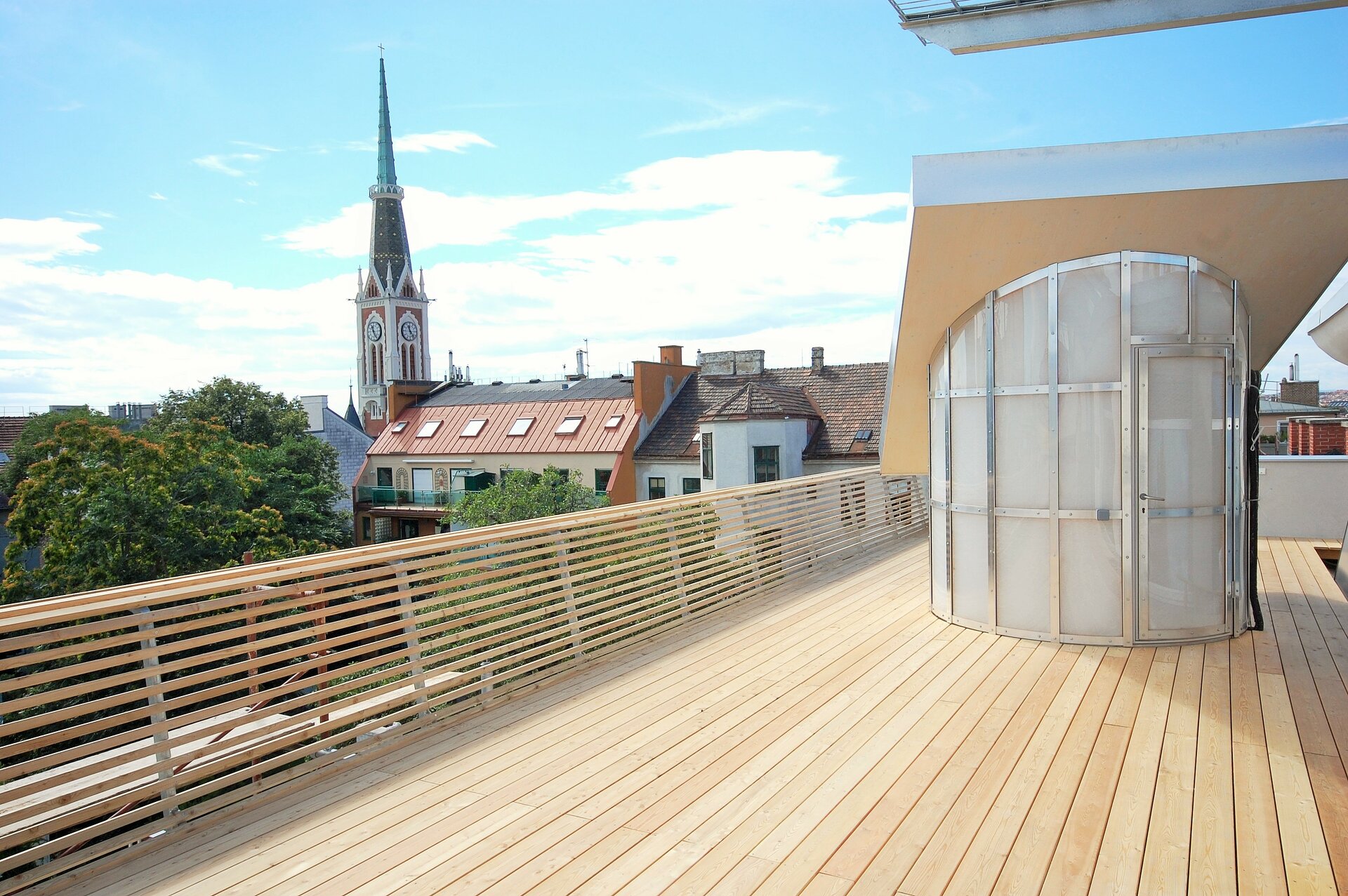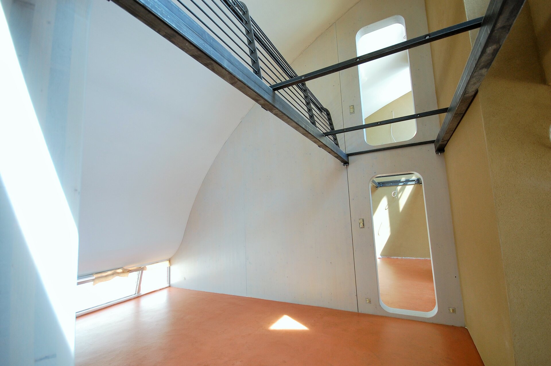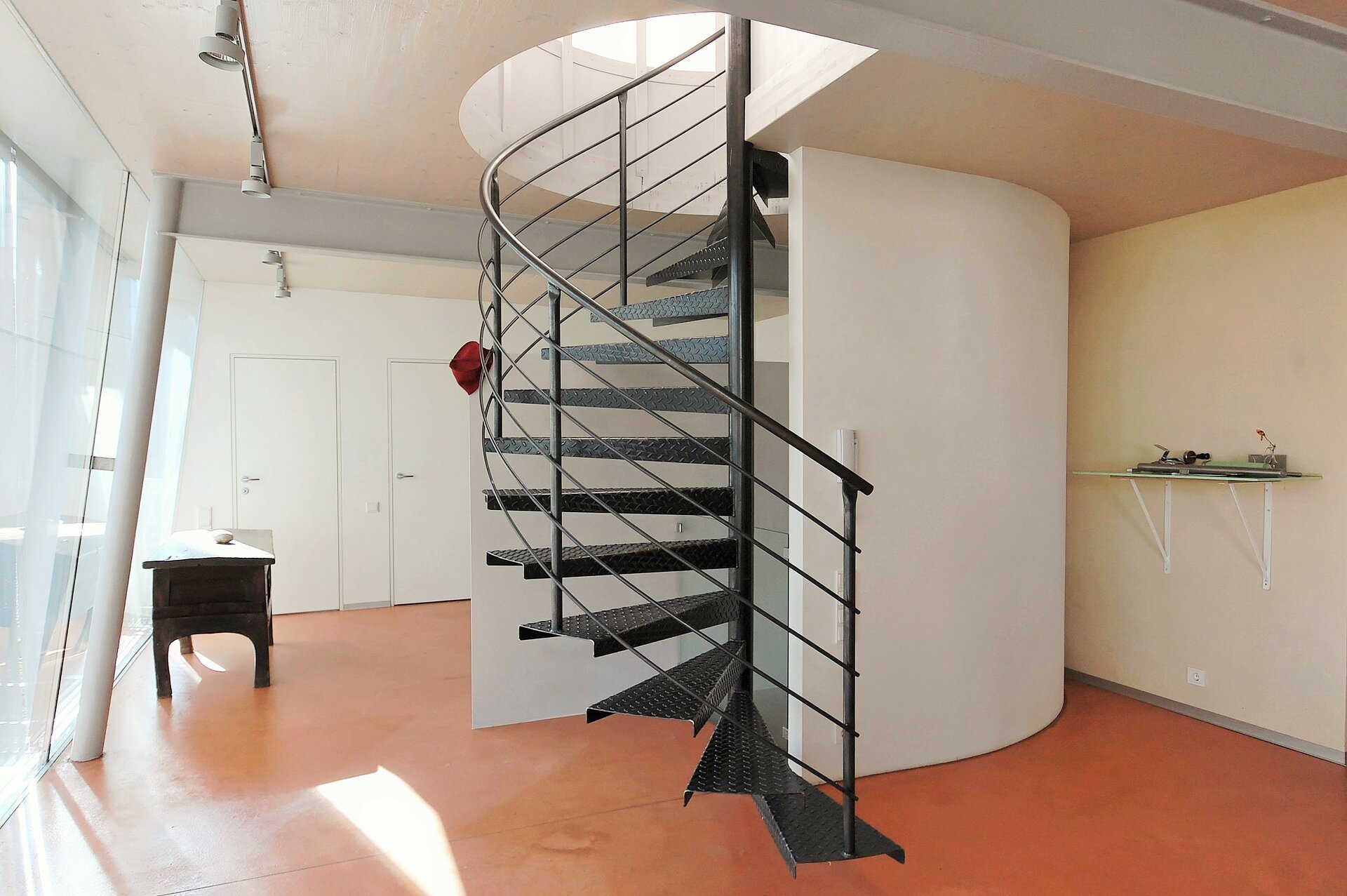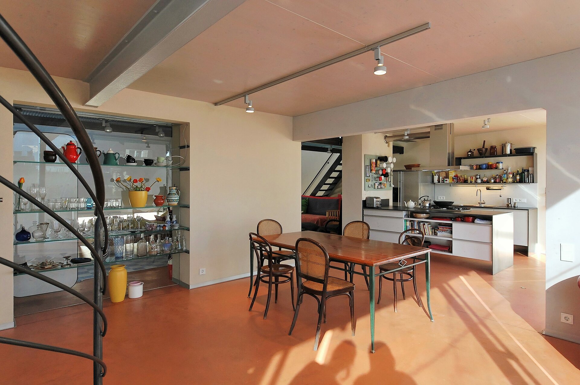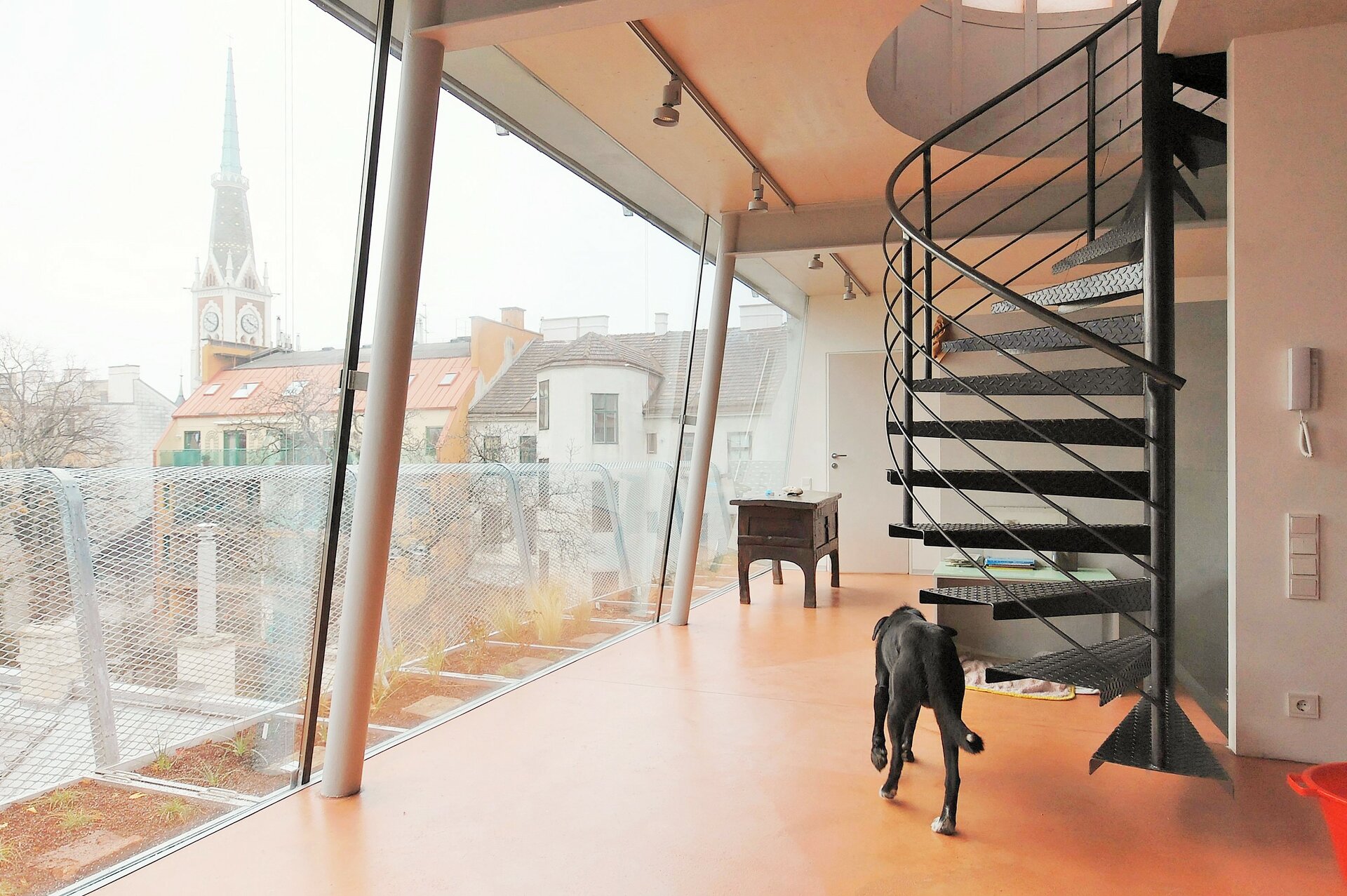 Interessante Durchblicke und Ausblicke, die immer wieder neue Perspektiven entdecken lassen, sowie räumliche Offenheit unter Wahrung von Rückzugsnischen bestimmen das Konzept. Intelligente unkonventionelle Detaillösungen und rohe Materialien, wie vorgefertigte Brettsperrholzplatten, unbehandelter Stahl, Sichtestrichboden und Lehmputz verleihen dem Innenausbau speziellen Charakter. Küchen-, Garderobe- und Badmöbel sind von den Architekten entworfen, darüber hinaus unterstreicht der Einsatz unterschiedlichster Wohnmöbel das unprätentiöse Flair. (Text: Marion Kuzmany)