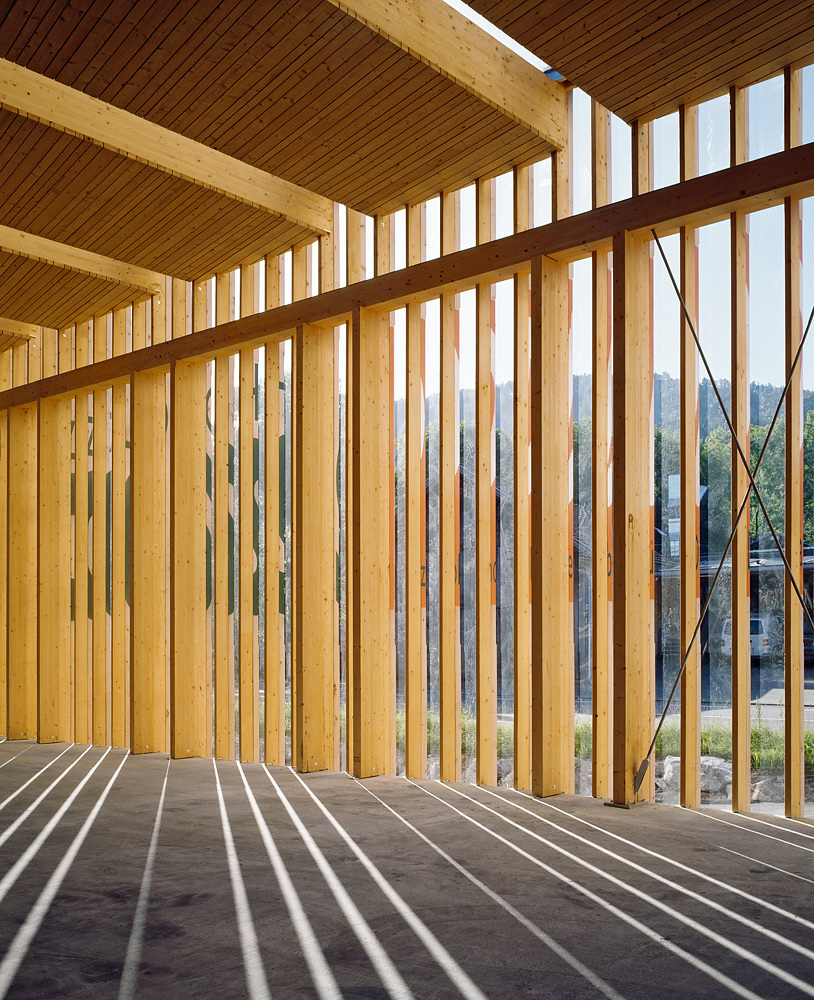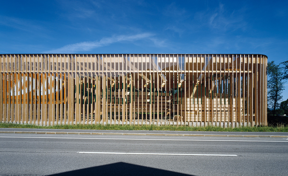 Eingefasst wird der Bau durch eine Hülle aus vertikalen Holzlamellen und Plexiglasstreifen, wodurch die Vernetzung der großflächigen Halle mit dem kleinteiligen Bürogebäude zu einem architektonischen Ganzen gelingt. Gleichzeitig löst sich der Bau durch die Lamellenstruktur in seine konstruktiven Elemente auf. Frontal zur Fassade stehend blickt man in die Halle hinein. Im Vorbeifahren wirkt die parallel zur Bundesstraße liegende Fassade geschlossen und das Firmenlogo wird sichtbar. An der abgerundeten Ecke ist die Fassade großzügig geöffnet, was einladend wirkt und den Blick in die Werkhalle erlaubt. Das Dach der Mehrzweckhalle liegt auf dem Bürobau auf. Durch Schlitze zwischen den einzelnen Deckenelementen kann Tageslicht einfallen, wodurch eine freundliche Atmosphäre geschaffen wird.