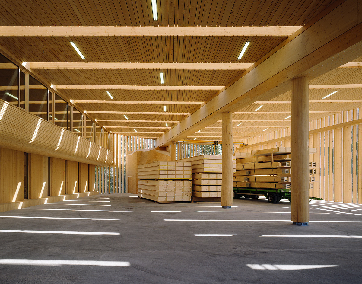 Das Holzbauunternehmen Sohm erfuhr auf einem zugekauften Grundstück eine bauliche Erweiterung. Wo anderorts gerne das Bürogebäude prominent zur Schau gestellt wird, ist hier ebendieses zurückversetzt. Die innovativen Holzerzeugnisse der Firma werden bei dem Gebäude in den Vordergrund gerückt, wodurch eine sympathische Anordnung entsteht: vorne sieht man das Produkt, die Arbeit, das Leben. Die Bregenzerwälder Firma produziert unter anderem Diagonal-Dübelholz, also Massivholzelemente, die nicht verleimt sind, sondern durch diagonal eingepresste Buchendübel formstabil verbunden sind.Der Neubau nutzt das unregelmäßige, stark abfallende Grundstück komplett. Im massiven Sockelgeschoss, welches teilweise in den Hang hineingesetzt ist, sind Lagerflächen und eine neue Heizanlage untergebracht. Darüberliegend befindet sich die große überdachte Mehrzweckhalle und der komplett aus Holz errichtete, zweigeschossige Büroteil.
