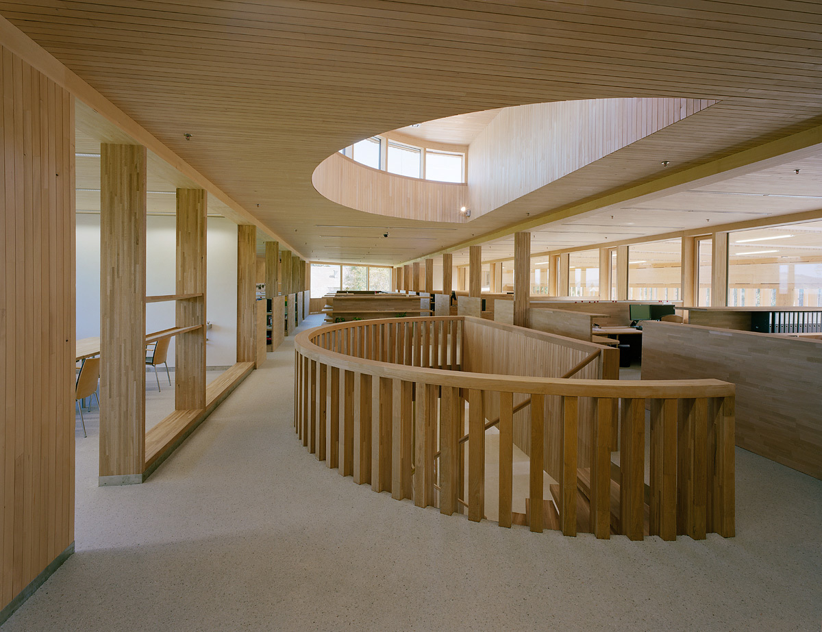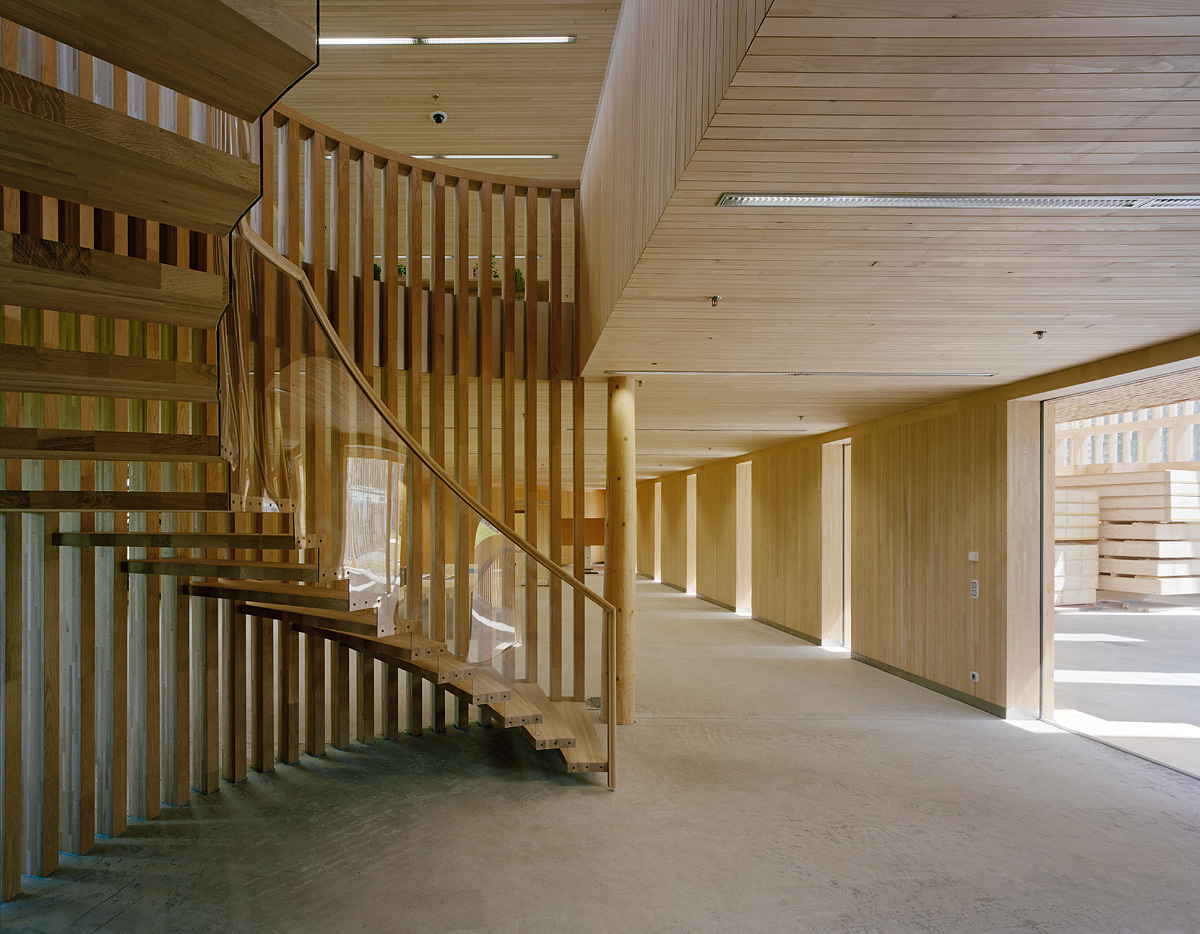 Der Bürotrakt ist vollständig in naturbelassenen Holzdübelelementen konstruiert. Großzügige, helle Innenräume bieten beste Voraussetzungen für ein angenehmes kommunikatives Arbeitsklima. Über eine halbrunde Treppe, die zusätzlich Tageslicht über eigene Oberlichter erhält, gelangt man in das weiträumige Obergeschoss, wo sich die Arbeitsplätze und ein Besprechungsraum befinden.