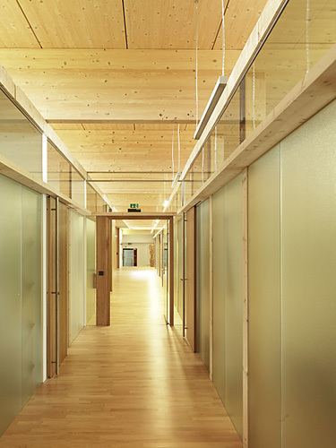 Im Verwaltungsgebäude wurden durch die Verlegung der Kantine notwendige Erweiterungsflächen frei. Schritt für Schritt und unter persönlicher Einbeziehung aller in den Büros Arbeitenden wurde dieser Bauteil umgebaut. Alle nichttragenden Gebäudeteile wurden entfernt, die Fassade geöffnet und die Bürofläche durch einen über die gesamte Länge gehenden, tiefen Fassadenrahmen aus Brettsperrholz räumlich erweitert. Sowohl Bürostruktur und –typologie, als auch die Materialwahl wurden im Gespräch mit den Mitarbeiter:innen gemeinsam entwickelt, die Materialien variieren dadurch auch von Abschnitt zu Abschnitt.