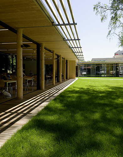 Ebenfalls neu gestaltet wurde der gesamte Eingangsbereich. Dort wo sich vorher nur eine überdimensionierte LKW-Zufahrt und ein Parkplatz befanden, führt nun ein Grünraum zwischen Forschungsturm und Kantine in das Areal, das mit direkten Wegen neu erschlossen wurde. Bei allen baulichen Maßnahmen wurde besonderer Wert auf die Verwendung von naturnahen, unbehandelten Materialien gelegt, sämtliche Dächer und einige Fassaden wurden begrünt.