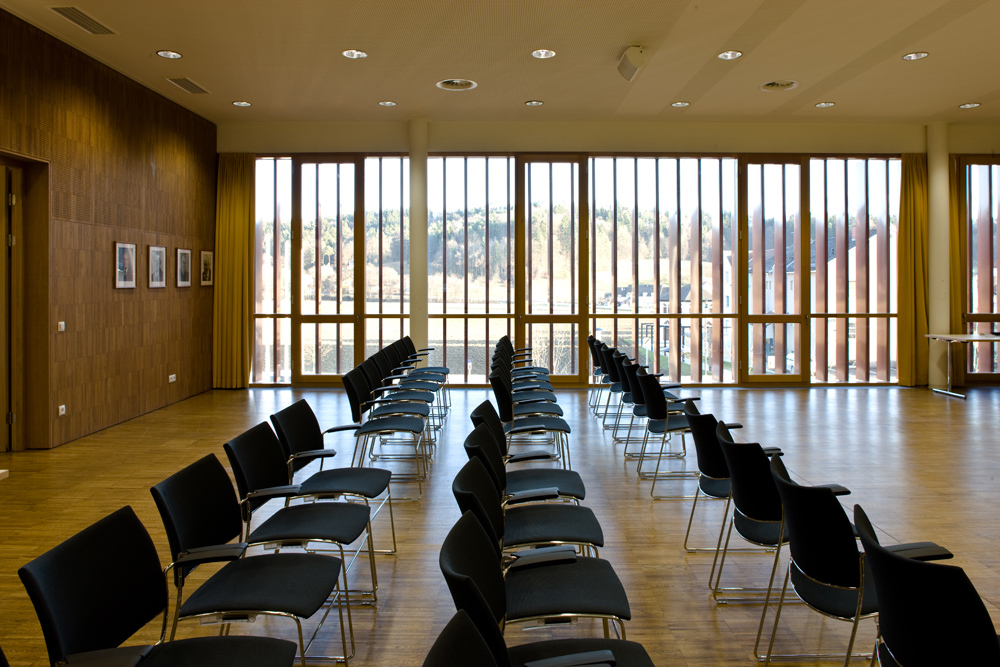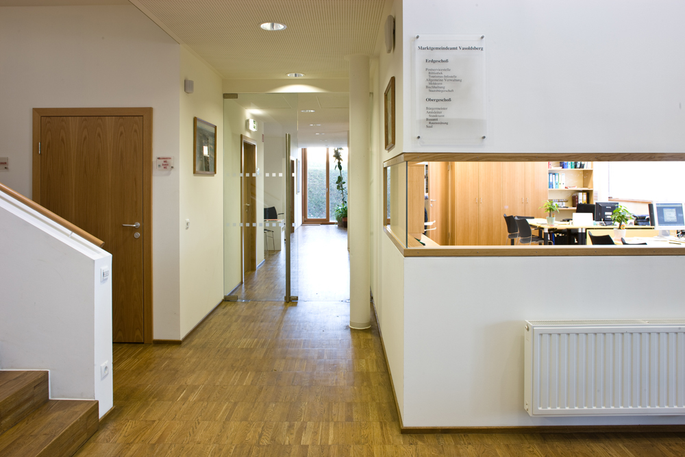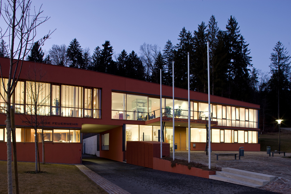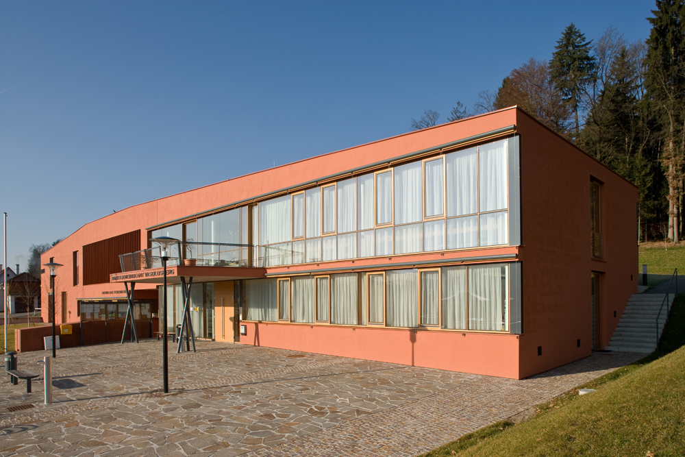Der Festsaal ist durch seine Bedeutung und seine räumliche Größe von außen ablesbar, wird sowohl über die Gemeinde als auch über die Feuerwehr erschlossen und markiert mit seinem zum Platz hin orientierten, loggienartigen Fenster, das zentrale Element des Gemeindezentrums. Das Gemeindeamt wird über das zentrale Foyer mittels Hauptstiege und Lift erschlossen. Die Büroräume des Gemeindeamtes werden bei Veranstaltungen im Festsaal abgeschlossen, sodass nur das Foyer und die Sanitäreinheiten doppelt genutzt werden können.