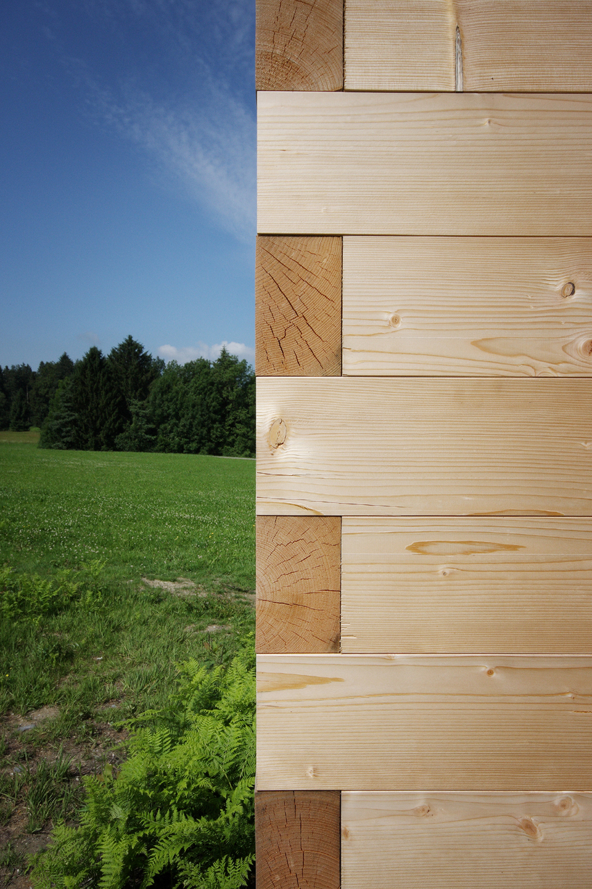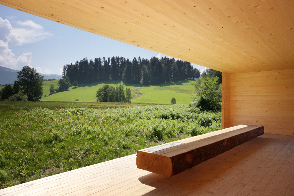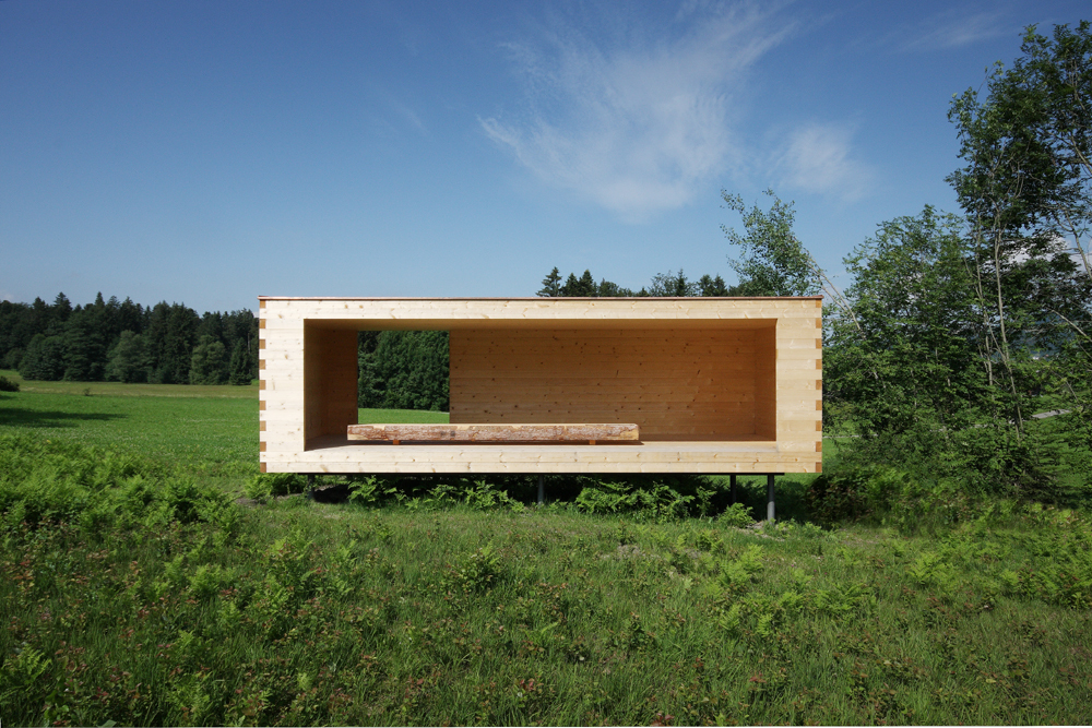 Am Übergang von landwirtschaftlich genutzter Heuwiese und angrenzendem Moor schwebt der Moorroom leicht über dem Gelände. Das einfache und reduzierte Gebäude soll Unterschlupf, Rastmöglichkeit aber auch Platz für Vorträge bieten. Die Naturlandschaft bleibt völlig unberührt, lediglich sechs Stahlsäulen durchdringen die Geländeoberkante. Das große offene Tor mit den vorgelagerten Stufen signalisiert schon von weitem den Eingang und den öffentlichen Charakter. Die „fehlende Wand“ auf der gegenüberliegenden Längsseite fokussiert auf die weite Moorlandschaft. Boden, Decke und Seitenwände des Raumes schaffen ein gerahmtes Bild. Sämtliche haustechnischen Installationen sowie Türen, Fenster, Geländer werden weggelassen, um auf die natürliche Umgebung angemessen zu reagieren. In der Mitte des Kubus ist ein weiterer „Moorsitz“ platziert. Die unbehandelten Oberflächen des aus massiven Holzbalken „gestrickten“ Baukörpers unterstreichen in der Haptik den puren Anspruch und sind robust genug, Witterung oder gar Vandalismus auszuhalten. (Text: Martina Pfeifer Steiner)