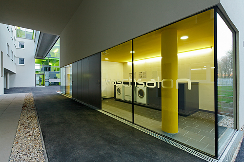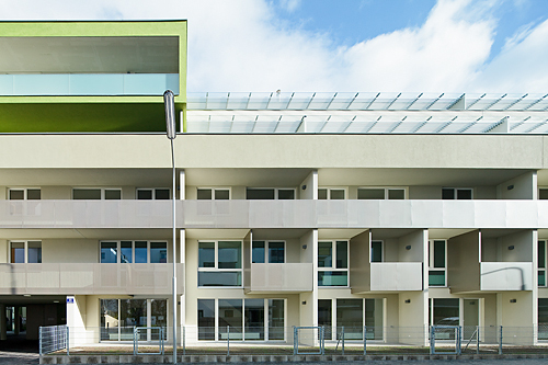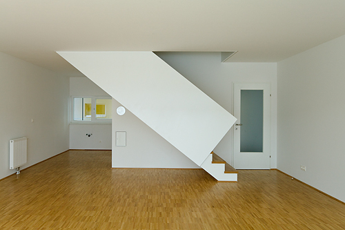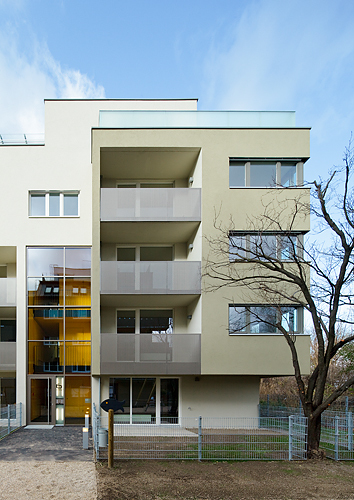 Die Wohnungen sind in den untersten Geschossen als Maisonetten geplant. Wie kleine Reihenhäuser bilden sie, mit ihren, das äußere Fassadenbild strukturierenden, Loggienschoten die Basis des Wohnbaus. Darüber entwickeln sich Geschosswohnungen mit zwei bis vier Zimmern, alle mit Loggia, die sich als lange Bänder in der Fassade zeigen.