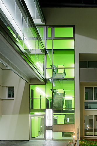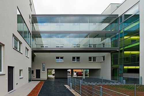 Das Baukörpergefüge besteht aus dem Haupttrakt an der Moselgasse und vier Kämmen im Gartenbereich. Die Kämme sind an den Straßentrakt angedockt. In dieser Nahtstelle liegt die Hauptverteiler-Achse der Anlage mit allen Gemeinschaftseinrichtungen. Hier befinden sich Abstellräume für Kinderwagen und Fahrräder, der Gemeinschaftsraum und der Waschsalon mit zugeordnetem Kleinkinderbereich. Diese Achse ist das Hauptwegesystem im Erdgeschoß mit Zugang zur Strasse und Wohnwegen in den Garten. In gleicher Weise entspannt sich ein Wegesystem über eine verglaste Brücke im zweiten und dritten Obergeschoss. Die Brücke verbindet die beiden Stiegenhäuser des Haupttrakts. Auf ihr lässt sich die gesamte Anlage durchwandern und die Gartenhöfe überschauen.