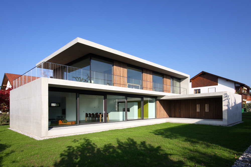 Der Wohnbereich öffnet sich feudal zum Garten. Vor den Nebenräumen entsteht ein geschütztes Freiluftwohnzimmer. Die Räume im Obergeschoss sind ebenfalls nach Süden orientiert. Der schmale Balkonstreifen mündet in die große, teils überdachte Terrasse, die dem Arbeitszimmer des Lehrer-Paares zugeordnet ist. Auf Details wurde von den sehr informierten und interessierten Bauherren größter Wert gelegt: abzulesen in durchgängiger Materialwahl, wie geräuchertes Eichenparkett im ganzen Haus, individuell entworfenen Möbel und einem besonderen Farbkonzept. Es werden die Le Corbusier Farben von kt.COLOR verwendet, die durch Naturpigmente außerordentliche Leuchtkraft entfalten und sich mit den Lichtverhältnissen verändern. In der Küche wird mit speziellem Bürstenverfahren mehrschichtig veroliv aufgetragen, im Flur an einer Wand violett, in einem Zimmer umbra, im anderen mittelblau.