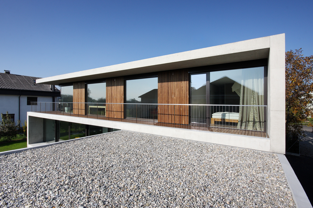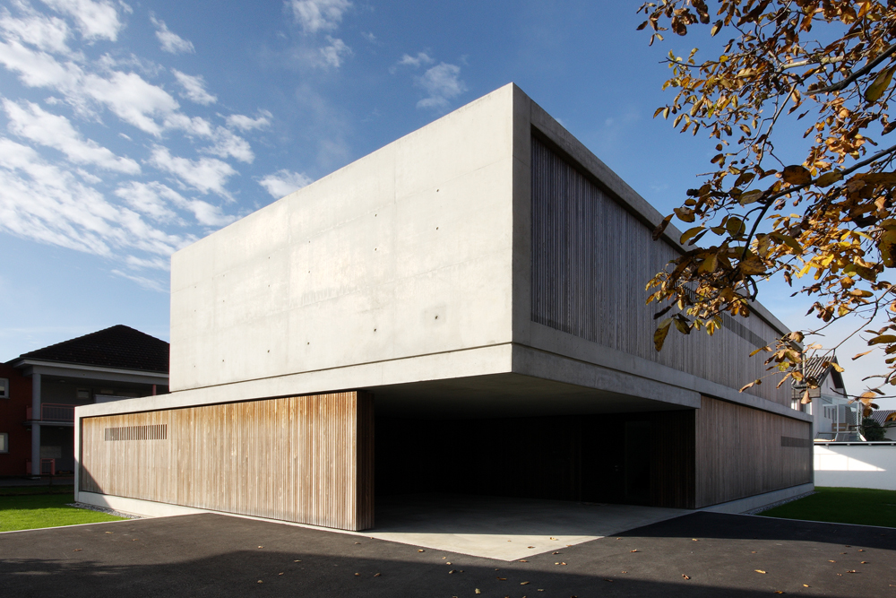Das Gebäude wirkt elegant in seiner klaren Linienführung und Reduktion der Materialien: Holzwände – genauer ein witterungsbeständiges Eschen-Thermoholz - und Glas füllen die vertikalen Flächen aus, nach Norden geschlossen, mit schmalen Öffnungsschlitzen, nach Süden und Westen großzügig geöffnet und zurückversetzt, dadurch entstehen Balkon und gedeckte Terrassen.