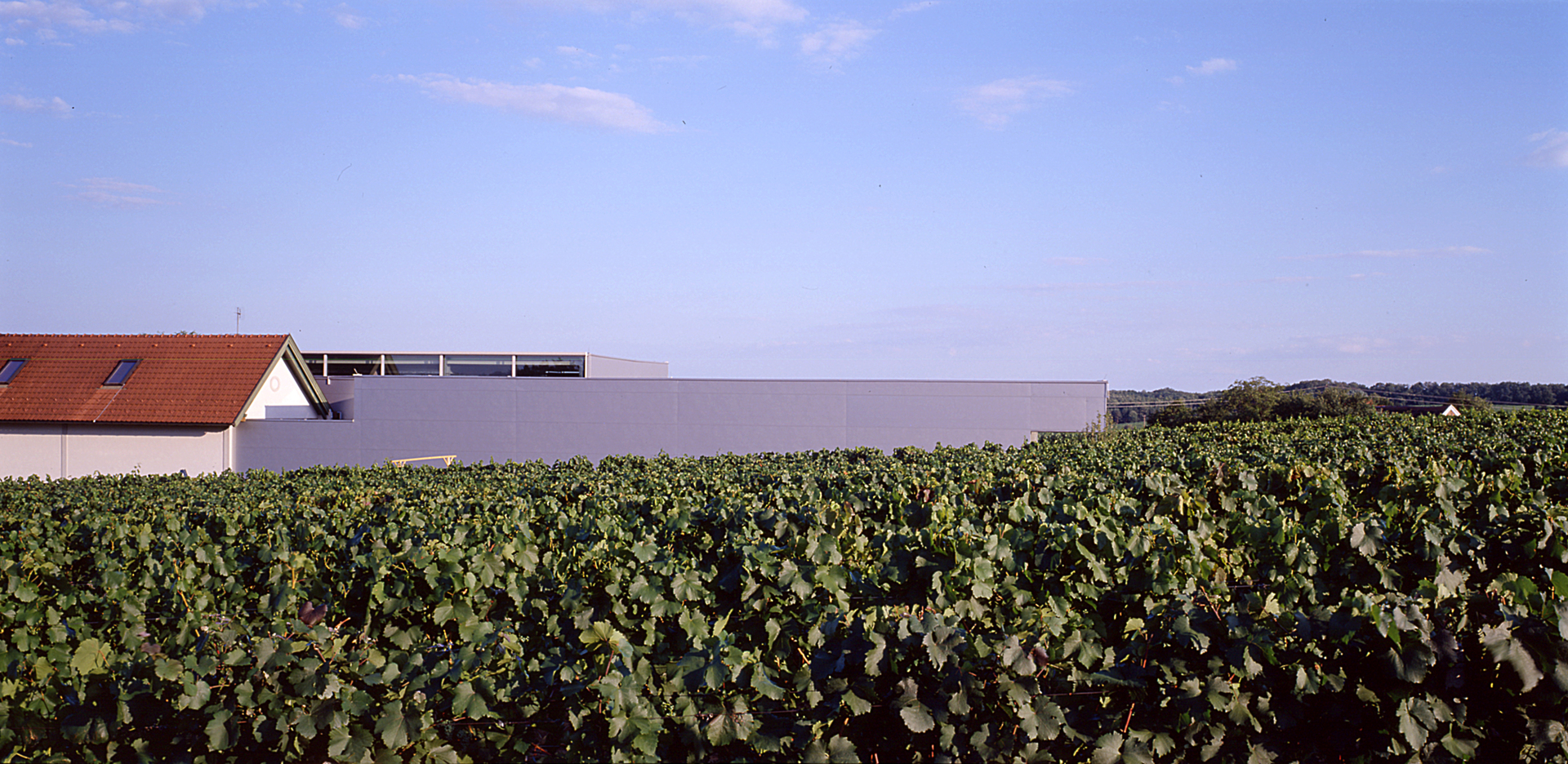 Auf dieser Basis steht die Hülle der Press- und Gärtechnologie, ein mit verzinktem Stahlblech ummanteltes Stahlgerüst, ein Dachkörper, der den damit eingehausten Stahltanks, Abfüllanlagen und Hochregalen technisch und formal nicht nachsteht. Der gestufte Querschnitt der Halle spiegelt die verschiedenen Rangierhöhen, von der überdachten Zufahrt bis zum Labor; der verglaste Horizontalstreifen zwischen den Dachebenen führt