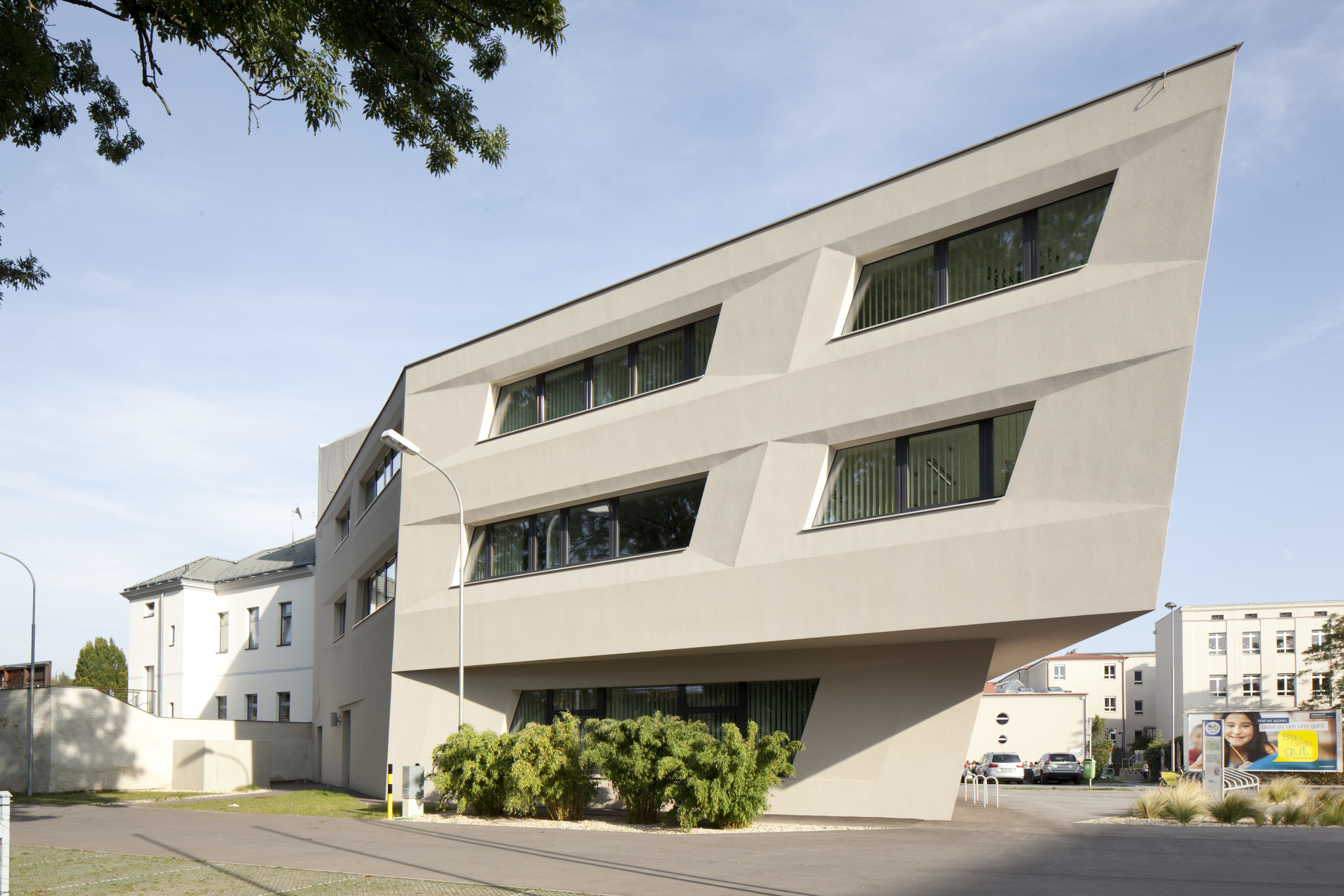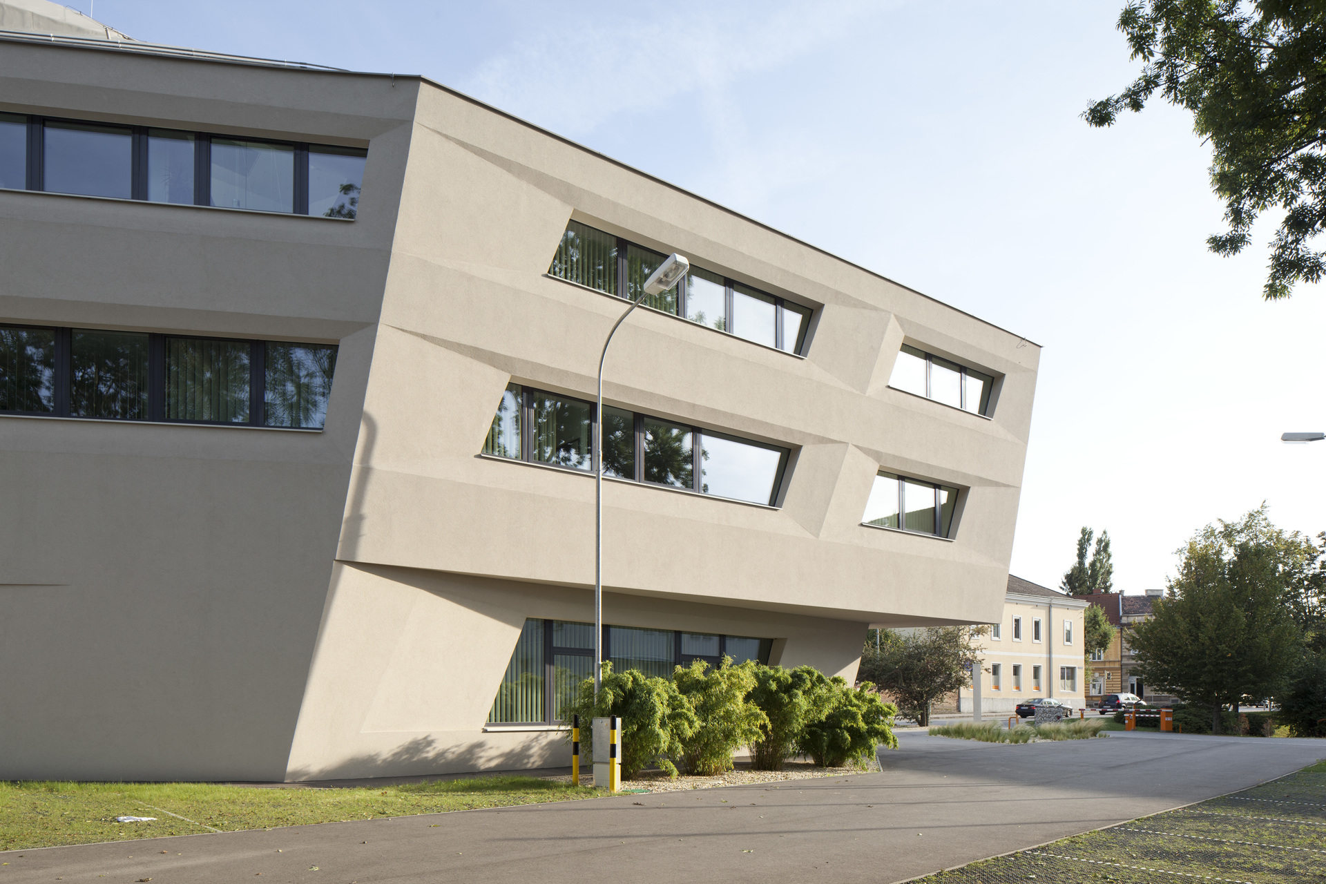 Chalabi Architekten und Partner entwickeln ihre Projekte im wortwörtlichen Sinn: Gebäude werden zu rotierenden Spiralen, Fassaden häuten sich vermeintlich. Die Architekten setzen sich mit ihren Entwürfen über gebaute Traditionen hinweg und die Gesetze der Physik bieten kaum Einschränkungen. Das Gebietsbauamt wäre ursprünglich als Niedrigenergiehaus mit einer hinterlüfteten Fassade geplant worden, später wurde die Vorgabe auf Passivhausstandard „erhöht“, woraufhin ein beachtlicher Teil des Budgets für die Haustechnik aufgewendet werden musste. Die Architekten bemühten sich, ihren Entwurf unter den geänderten Vorgaben auszuführen. Die Fenster sind nun Bestandteil der dreidimensionalen Fassadengestaltung und mit minimalem Spiel über die Wärmedämmung, sogenannten Facettierungen um die Fensteröffnungen, ensteht so eine neue Variante zur „Lochfassade“.