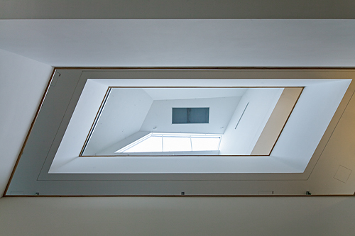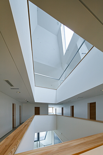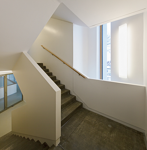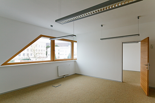 Das Innere ist räumlich sehr differenziert ausformuliert und erzeugt so unterschiedliche Raumerlebnisse. Bestimmend im Erdgeschoss ist der öffentliche Charakter mit dem großen Besprechungsraum. Im 1.Obergeschoss grenzen Zellenbüros an den öffentlichen Kommunikationsraum des Atriums. Das 2. Obergeschoss hingegen öffnet sich als großzügiges Gruppenbüro in den loftartigen Dachraum mit Atriumverglasung und Blick in das gefaltete Dach. Der Weg ins 2 Obergeschoss führt von der Enge in die Weite, auch die Raumhöhe nimmt nach oben hin zu, so wird der Parteienverkehr zum Vergnügen. (Text: Architekt, redaktionell überarbeitet und erweitert Martina Frühwirth)
