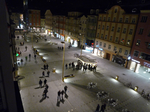 Am südlichen Ende steigt der Platz in drei breiten Stufen leicht an: Die Stufen können als Bühne für verschiedene Veranstaltungen dienen oder bieten aus dem Straßenraum herausgehobene Sitzplätze mit Blick auf Annasäule und Nordkette im Hintergrund. Ein Wasserbecken stärkt die Aufenthaltsqualität und schafft einen zusätzlichen Anziehungspunkt auf halbem Wege von Goldenem Dachl zur Triumphpforte.