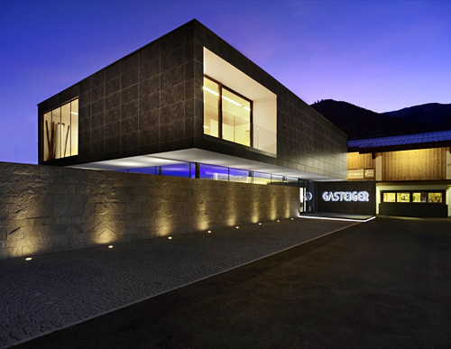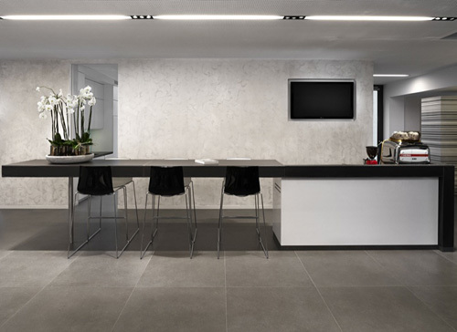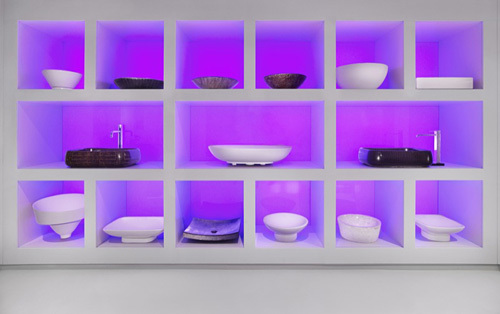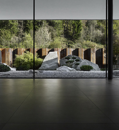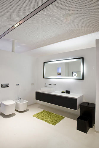 Der Neubau besteht aus einem schlichten Quader, im Erdgeschoss großflächig verglast und im Obergeschoss mit dunklen Mirage-Platten verkleidet. Eine vorgelagerte Wand blendet die Durchgangsstraße und die Gebäude der benachbarten Firmen aus und bildet einen intimen Innenhof, der als Stein-Garten konzipiert wurde. Im Erdgeschoss wird der Kunde an einer zentralen Bar empfangen, im Untergeschoss und Obergeschoss werden je 12 Badeeinheiten präsentiert. Der bewusste Verzicht auf große Fensterfläche erlaubt den stimmungsvollen Einsatz von künstlichem Licht und ein Eintauchen in die unterschiedlich gestalteten Bäderwelten. Die verwendeten Materialien wie Rauriser Marmor, Mirage-Platten oder Granitstein sind als edle Oberflächen selbst Teil der Gesamtausstellung. (Text: Claudia Wedekind)