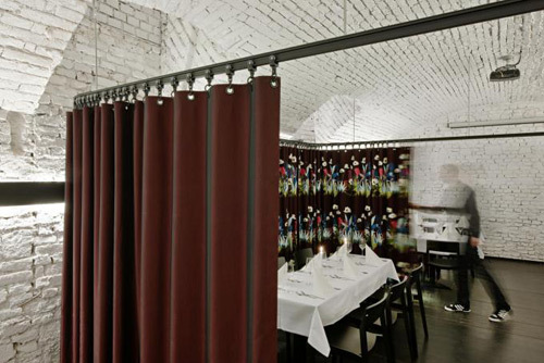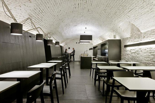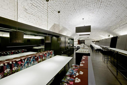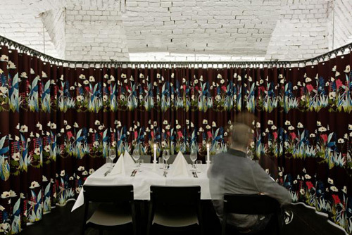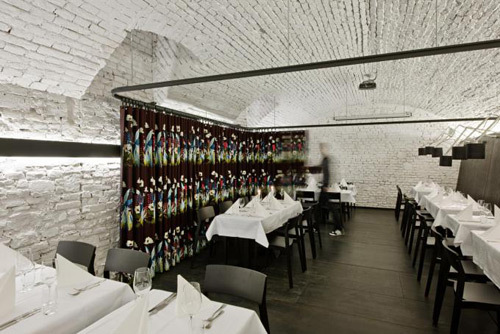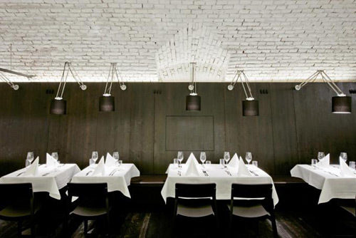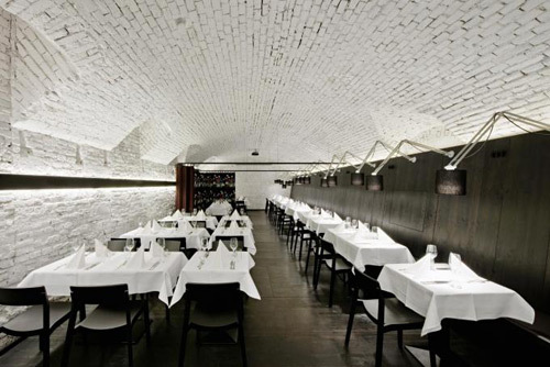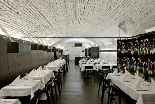 Dass Wirt Sebastian Laskowsky der Versuchung widerstanden hat, bei der Gestaltung auf allzu offensichtliche Wirtshausseligkeit zu verzichten ist ihm hoch anzurechnen. Das Sue-Architektenteam baute stattdessen ein sehr zeitgemäßes Restaurant in den Keller, das mit der Schank (samt extracooler Moooi-Leuchte) auch ein paar Anklänge an Wiener Wirtshaussituationen schafft. Überhaupt sorgt die Beleuchtung (ganz besonders die aus der Wand ragenden Schirmleuchten) für tolle Atmosphäre, auch die Stühle, die Lamperie sowie der als Raumteiler einsetzbare Kenzo-Vorhang mit reduziertem, floralem Muster machen sich gut: Ein schöner Raum, der in einer westeuropäischen Großstadt (wo man zu solchen Zwecken bekanntlich schnell einmal im Keller landet) durchaus als fashionables Restaurant funktionieren könnte.