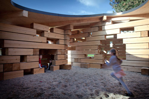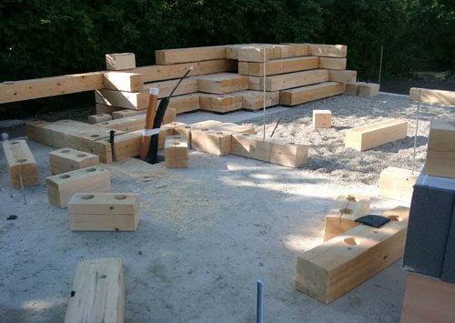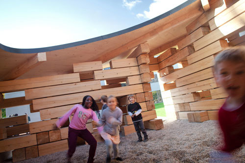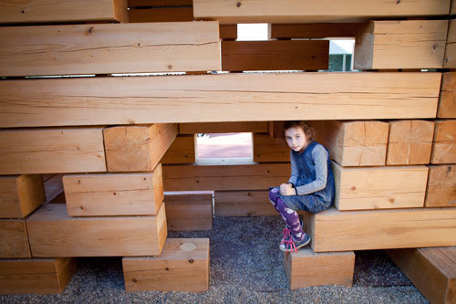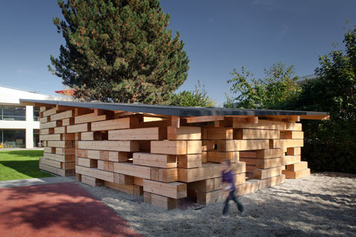 Die archaische Holzbauweise der Blockfügung ist in ihrer Einfachheit dem Spielen mit Bauklötzen ähnlich. In der Luftigschule schichten sich die Balken (28 x 28 cm) aber zu komplexeren Strukturen. Hier finden die Kinder feine Nischen und Ecken zum Verweilen und Spielen. Sie erleben die Qualitäten unterschiedlicher Fügungen: geschlossene Wände schaffen Geborgenheit, aufregende Auskragungen dienen als Tisch oder Bank, Öffnungen und Durchgänge ermöglichen Verbindungen und den Blick dahinter.