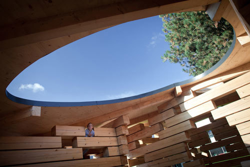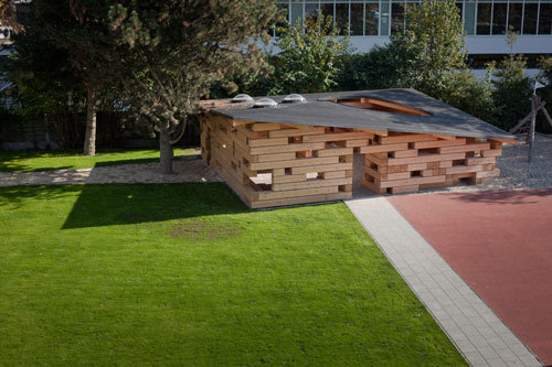 Während die äußeren Volumen als Nischen und Höhlen Platz für die Beschäftigung allein oder in kleinen Gruppen bieten, öffnet sich im Inneren unter dem ovalen Dachausschnitt ein größerer, gekiester Innenhof für Arbeit oder Spiel in der Gemeinschaft. Von dort gelangen die Kinder auch in den eigentlichen „Klassenraum“ der Luftigschule. Eine Tafel, einen Schrank und ein Waschbecken gibt es hier – wie in einem richtigen Klassenzimmer –, dazu aber noch runde Lichtkuppeln, durch die man die Äste der Bäume und den Himmel sieht, einen riesigen ringsum laufenden Balken als Bank und viele Löcher und Fugen in der Wand, durch die man in den Schulhof spähen kann. (Text: Tobias Hagleitner, Gunar Wilhelm)