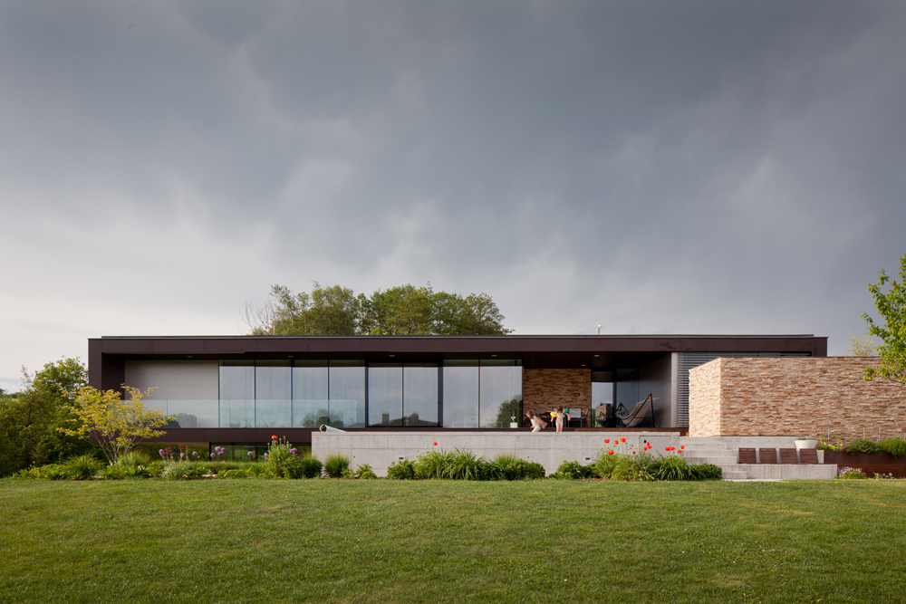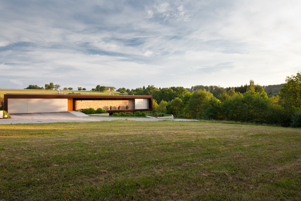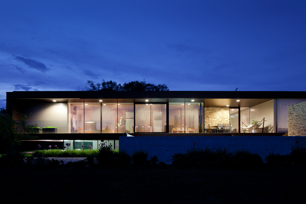Da das Gelände Richtung Süd-West abfällt, wird die Büroebene über ein Glasband belichtet und fängt ein von Natur umgebendes Panoramabild ein. Uns war es wichtig, wohnen und arbeiten nicht in seinen Blickbeziehungen zu stören. So richtet sich das Arbeiten Richtung Westen und das Wohnen Richtung Süden aus.