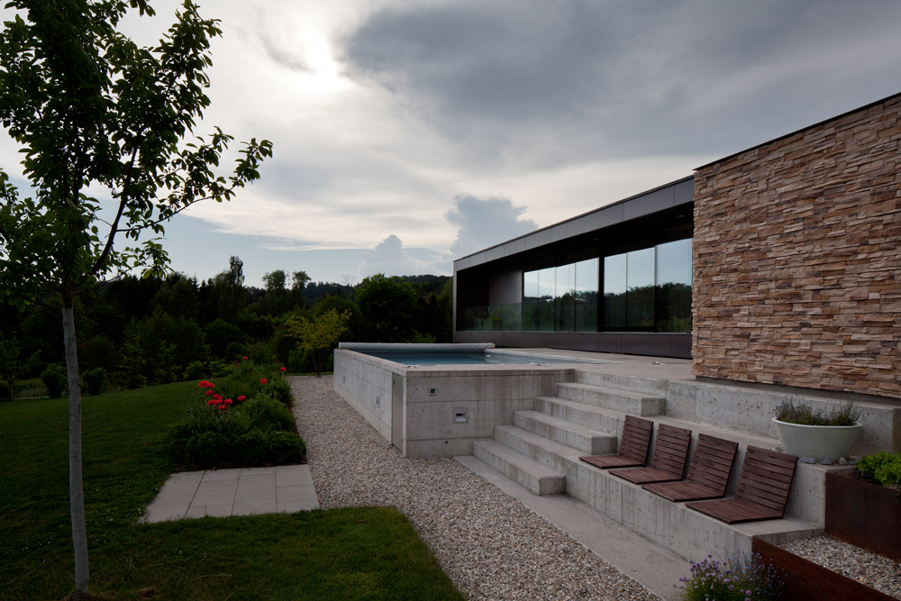Zusätzlich sollte das Haus zwar modern aber „gemütlich“ sein, sozusagen Wärme und Behaglichkeit ausstrahlen. Daher auch die gewählten Materialien - warme erdige Farbtöne mit einem gewissen Mix an Oberflächenstrukturen (Plattenfassade, Aluminium und Stein).